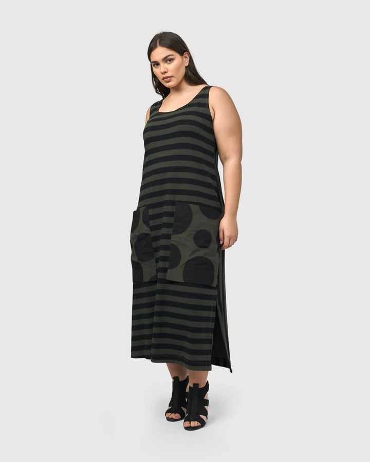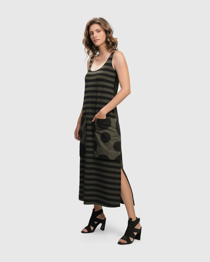 This slim cut maxi dress is made in a soft, stretchy jersey knit and features a deep scoop neck, front patch pockets in a contrast woven fabric, and a single side slit to show off some skin. Contrasting stripes in front and back. Figure hugging with a very subtle A-line flare.