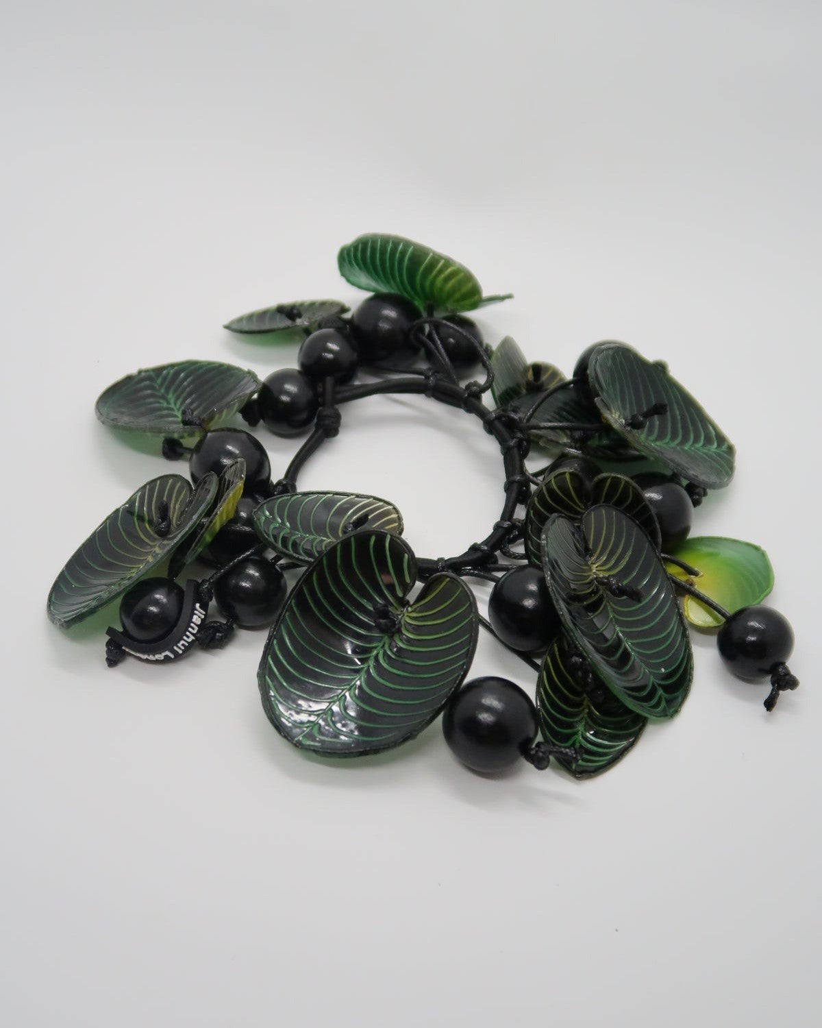 Bring nature's beauty to your style with our handmade bracelet crafted from recycled plastic bottles. Each piece is hand cut, hand painted, and hand carved into the delicate shape of a Coccoloba leaf, making it a true work of wearable art.