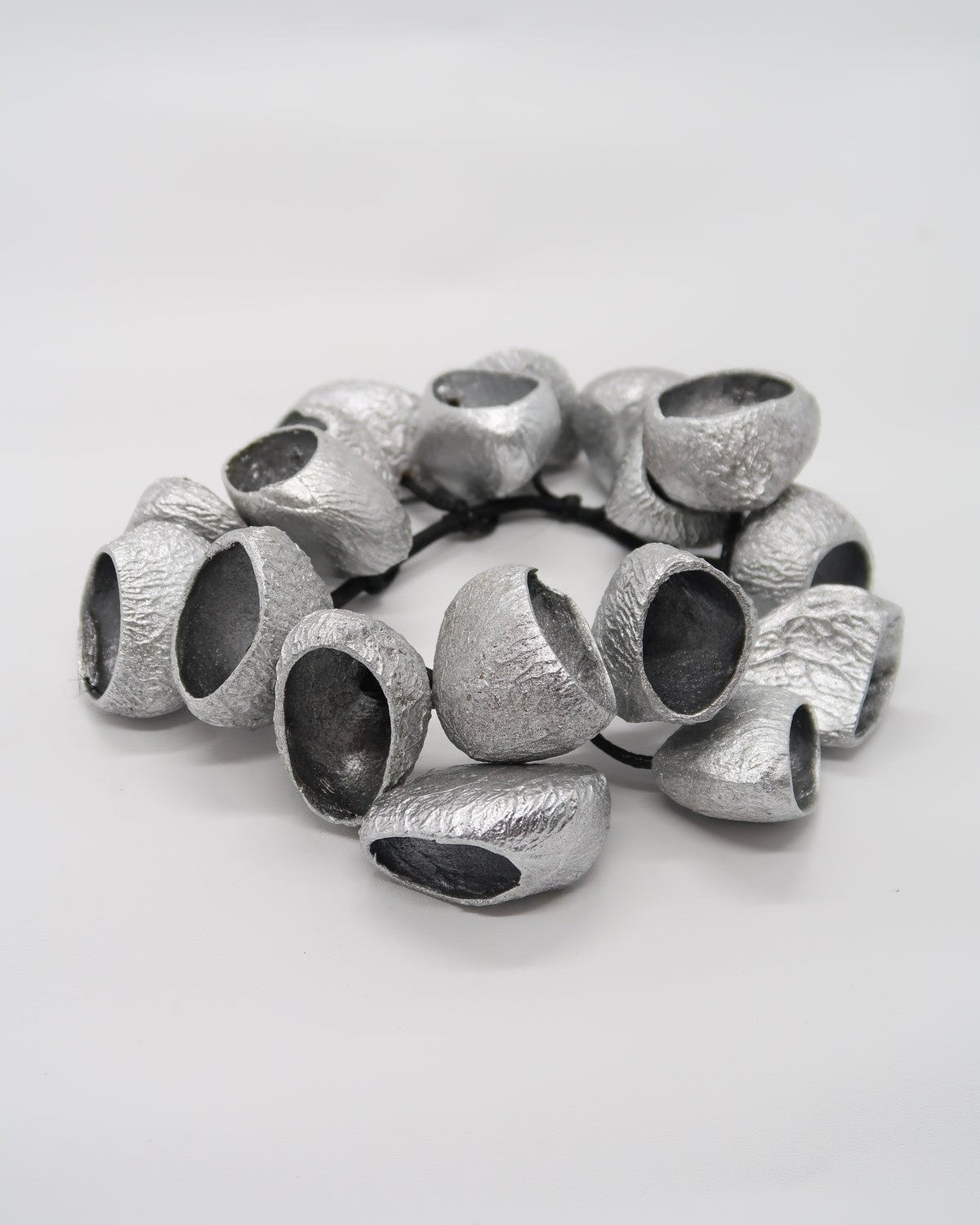 Add a touch of nature's magic to your style with this handmade statement bracelet, inspired by the soothing sounds of nature. Crafted from recycled Pangium seed shells, each piece is hand-cut and hand-painted into a delicate bell shape that creates gentle sounds when you move.