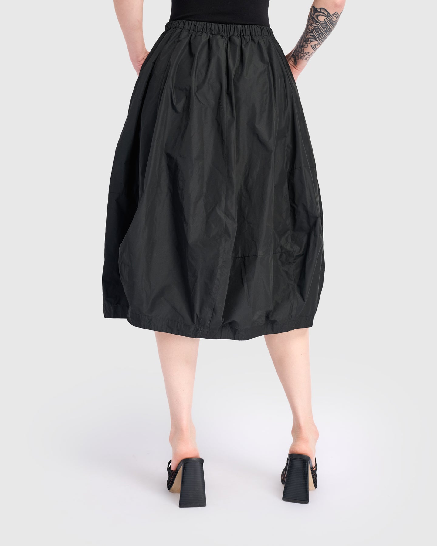 Cut in lightweight taffeta with a subtle sheen, this cocoon skirt balances a fitted waist with generous volume. Pieced panels enhance the drape, creating movement through the below-the-knee length. An elastic back waist ensures comfort, while side pockets add everyday ease. A polished statement skirt that pairs effortlessly with knit tops or crisp shirts.