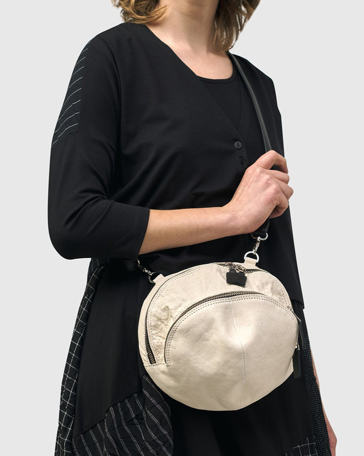 This circular canteen bag is a super cute and functional accessory to elevate any outfit. With a rounded design made to expand with you (take note of the removable and adjustable leather strap), plus plenty of pockets: one large man pocket with additional interior zip pocket, and front pocket for bits and bobs.