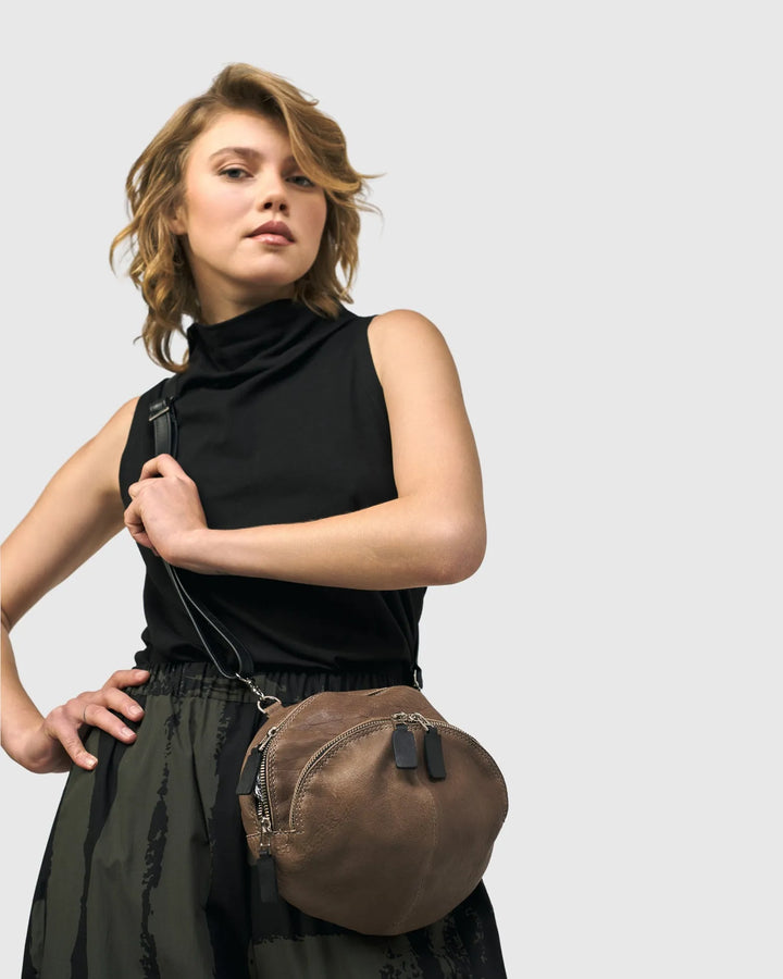 This circular canteen bag is a super cute and functional accessory to elevate any outfit. With a rounded design made to expand with you (take note of the removable and adjustable leather strap), plus plenty of pockets: one large man pocket with additional interior zip pocket, and front pocket for bits and bobs.