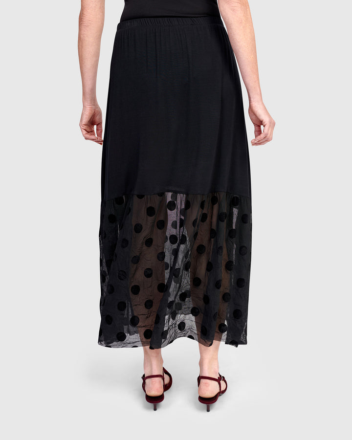 Elegant and straightforward, this high-rise maxi skirt has a stretchy all-around elastic waist, A-line silhouette and is made in a mix of soft stretch jersey knit with velvet dot mesh from the knee to hem. Perfect for a formal event, or if dressing down, pair with boots or sneakers and a comfy oversized sweater or fitted cardigan top.