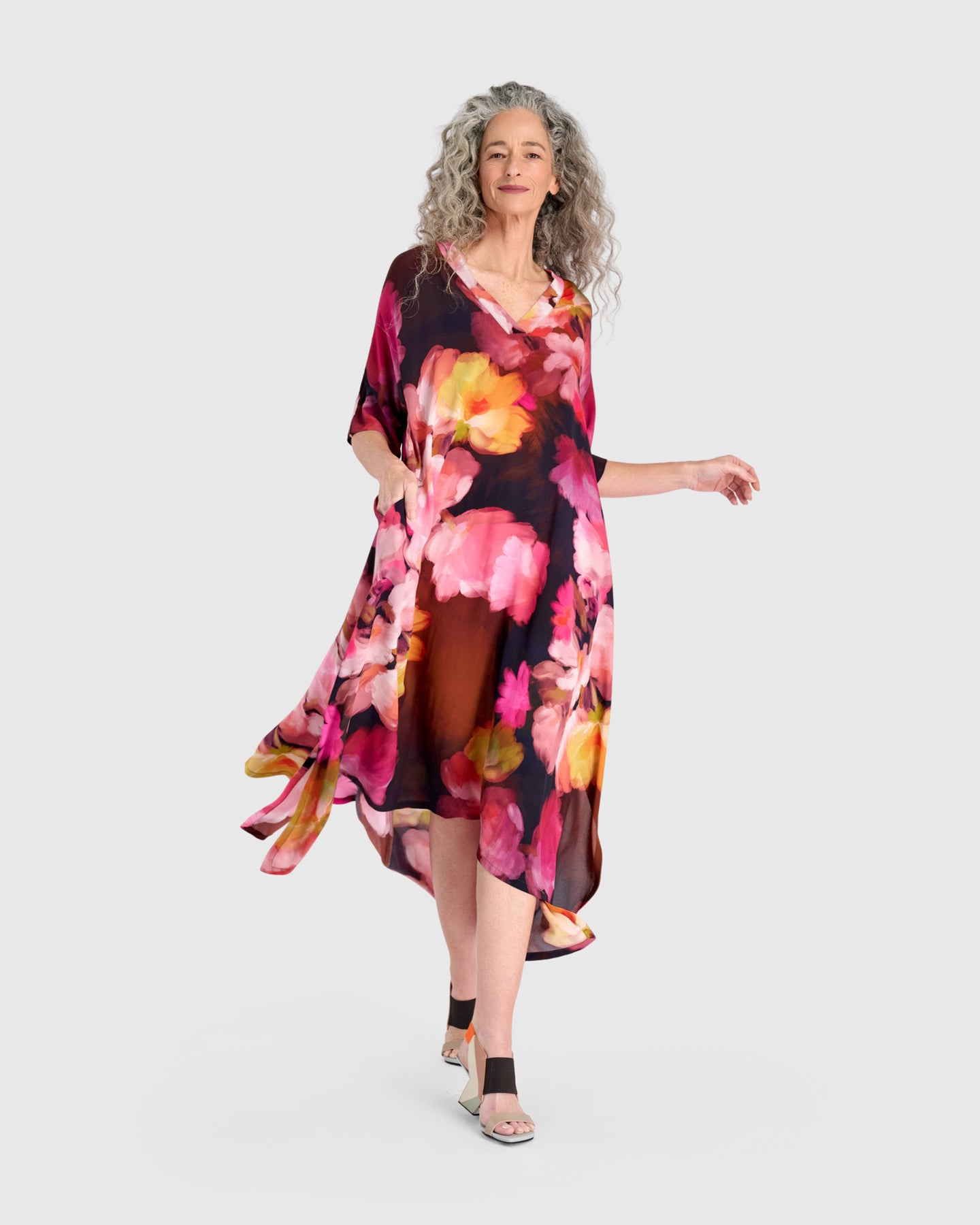 A flowing maxi caftan in lightweight viscose chiffon, designed to drape away from the body with airy movement. The swingy A-line silhouette is balanced by dolman sleeves that fall to the elbow and a clean v-neckline for an elongating finish. Side pockets keep it practical for everyday wear. A printed caftan that works as an effortless warm-weather dress, travel piece, or easy statement layer.