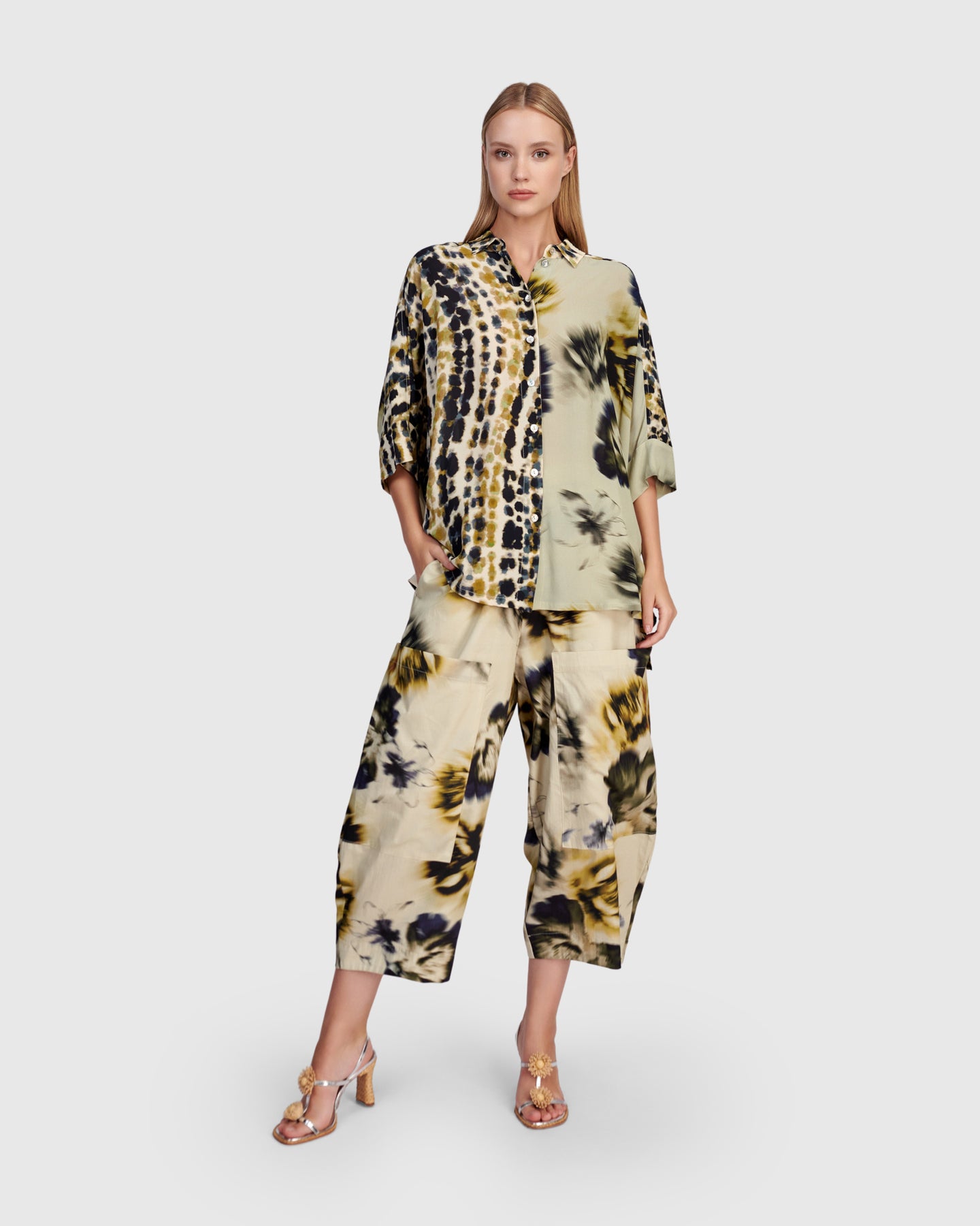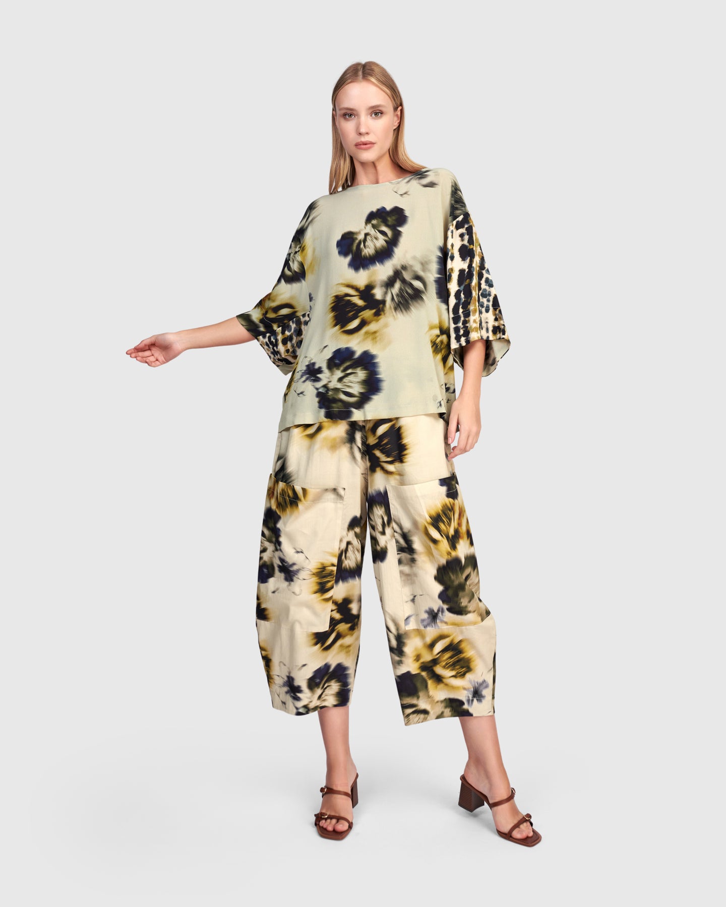 A modern barrel pant in crisp cotton poplin, designed with a high-rise waist and a wide leg that tapers at the hem. The cropped length keeps the silhouette light and easy, while subtle volume through the leg adds shape without bulk. Finished with an all-around elastic waist and both side and front pockets for function.