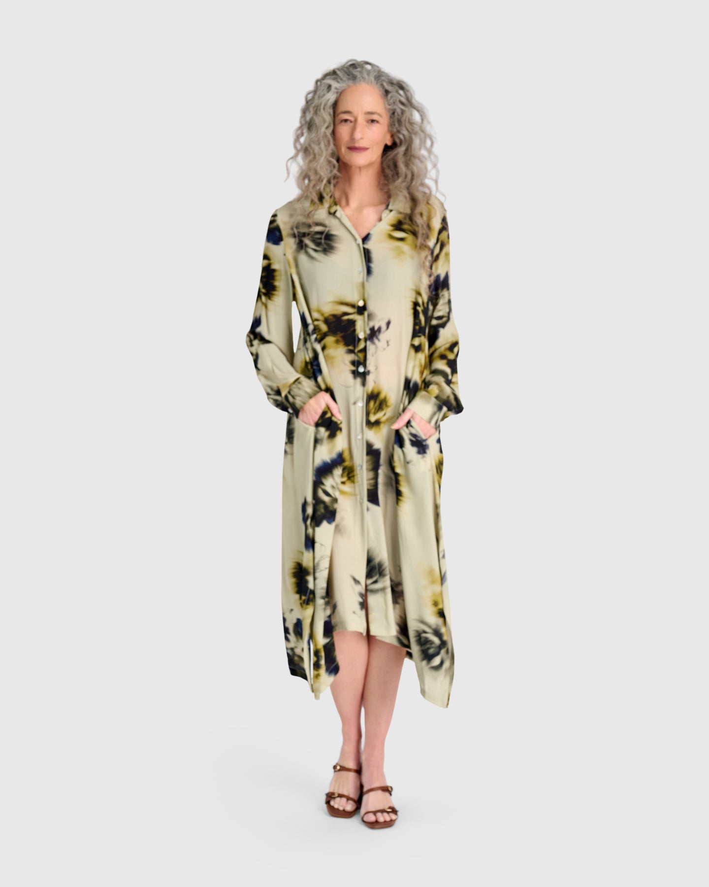 A lightweight chiffon shirtdress with a relaxed, boxy A-line shape and an easy midi length. The viscose fabric has a fluid drape that moves cleanly, balanced by a foldover collar and full button placket for classic shirting detail. Long sleeves finish with button cuffs, and side slits add movement at the hem. Designed with side pockets for everyday wear, this printed midi dress layers beautifully with a cropped jacket or worn on its own.