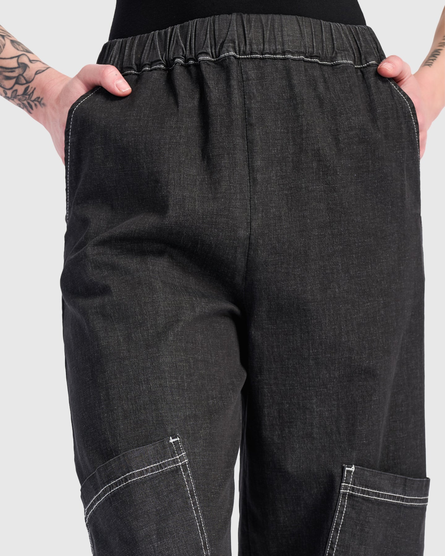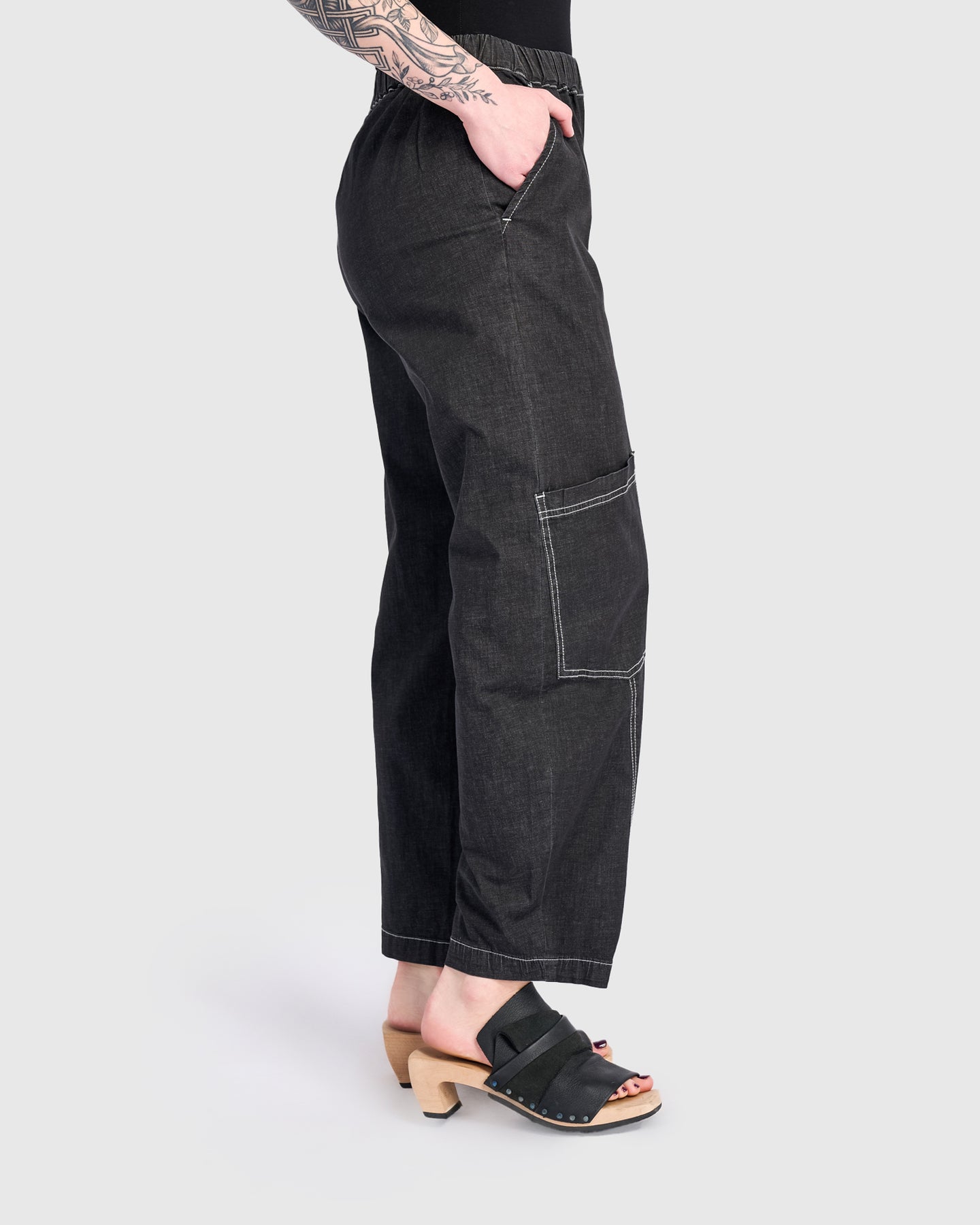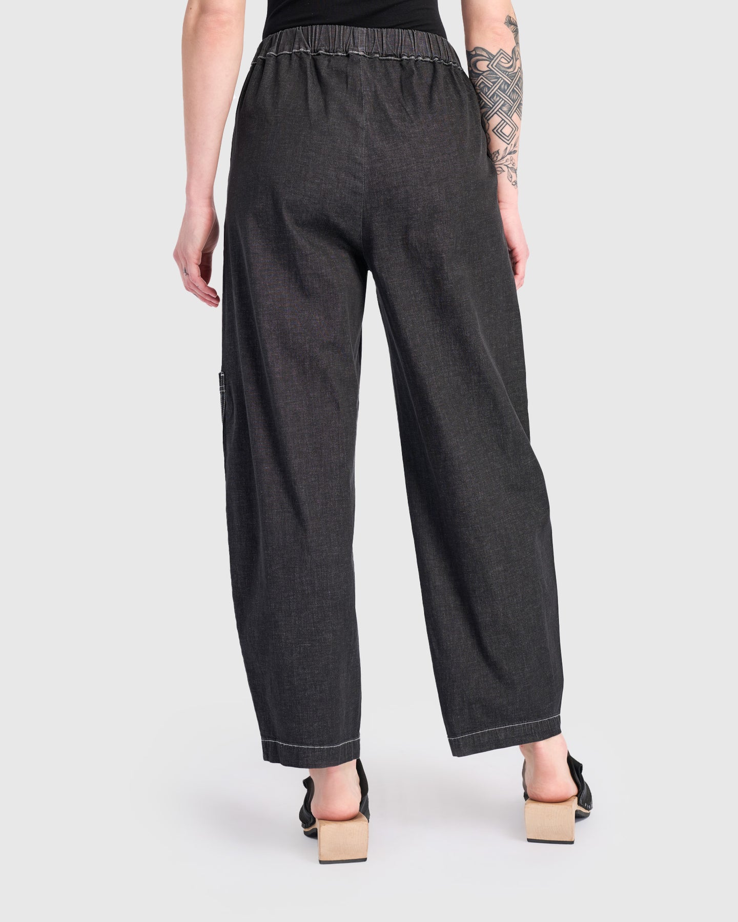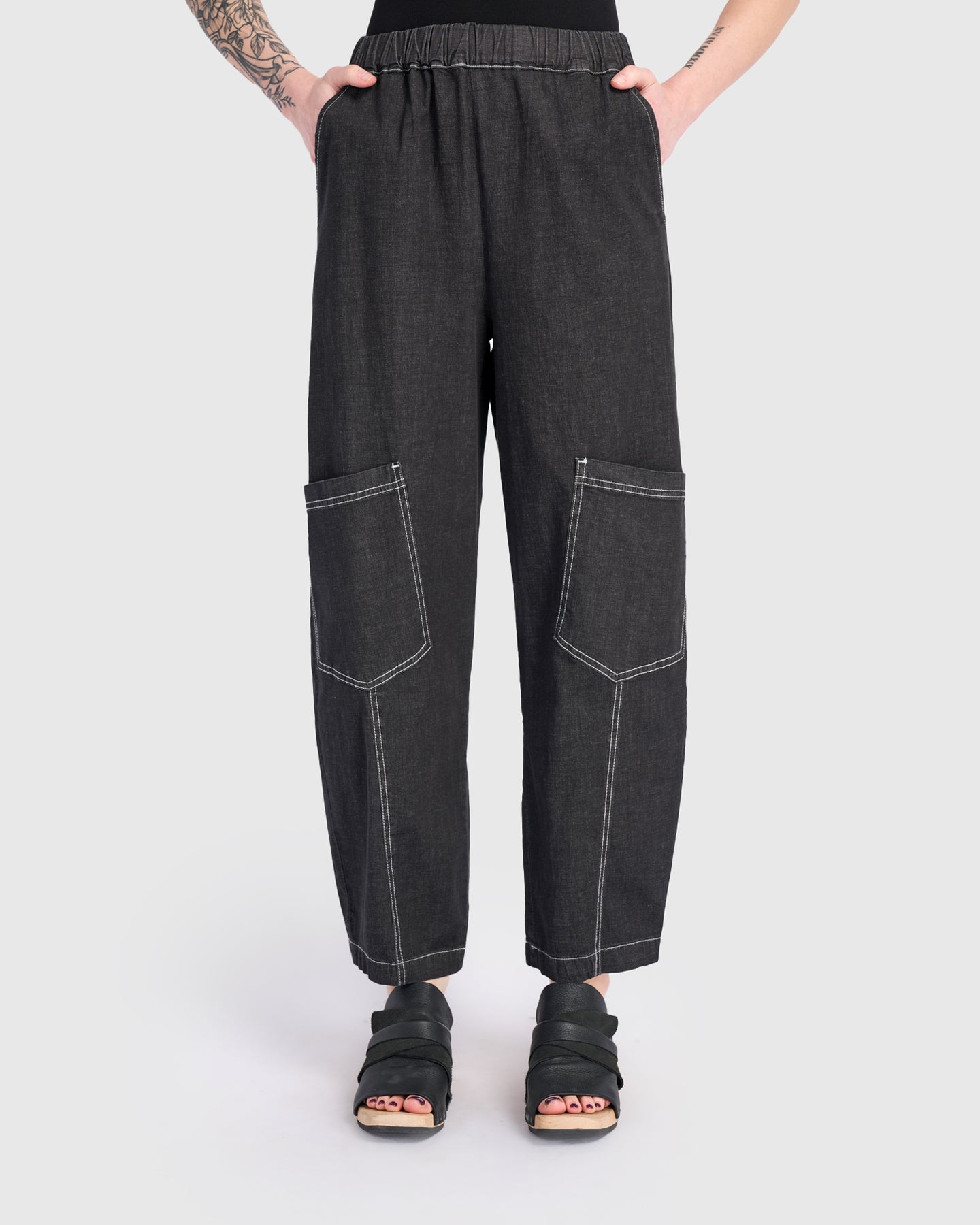 Relaxed barrel-leg pants crafted in soft black denim with a hint of stretch. Designed with an easy pull-on waist and full length for versatile styling. Tapered hems create a modern profile, while functional patch and side pockets bring utility to everyday wear. Pair with a crisp blouse or oversized tunic for an effortless, contemporary look.