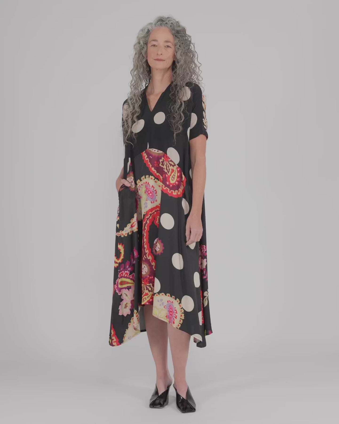 It's a late night affair in this billowing caftan dress with a V-neck, short dolman sleeves, and paisley and dot print. Made in a mix of sheer chiffon and satin-feel woven fabrics, it's loose-fitting from bust to hem, falling at a maxi length with slight hi-lo hem. Cami layer recommended (not included).