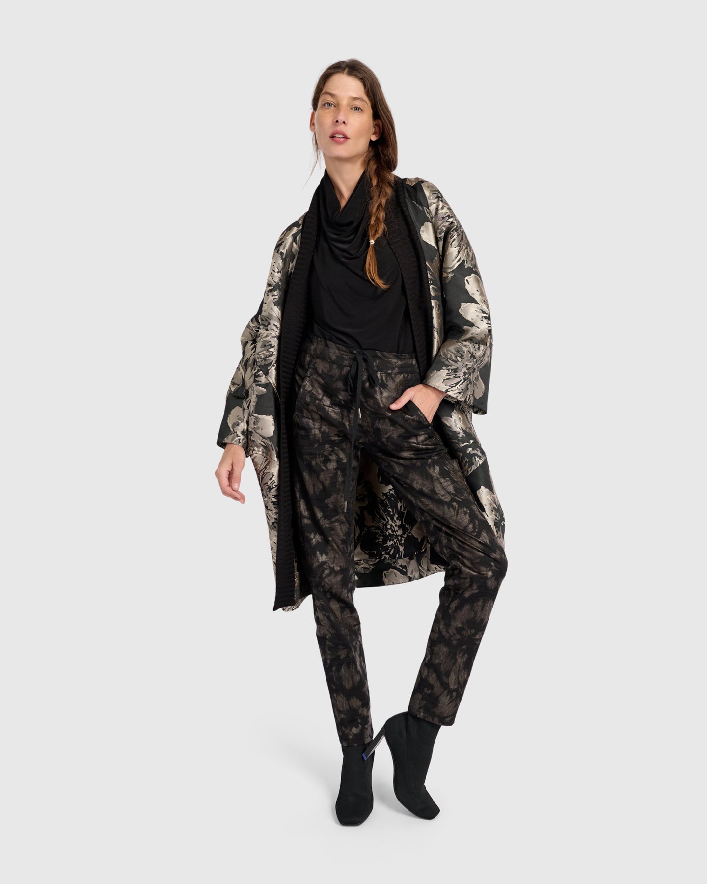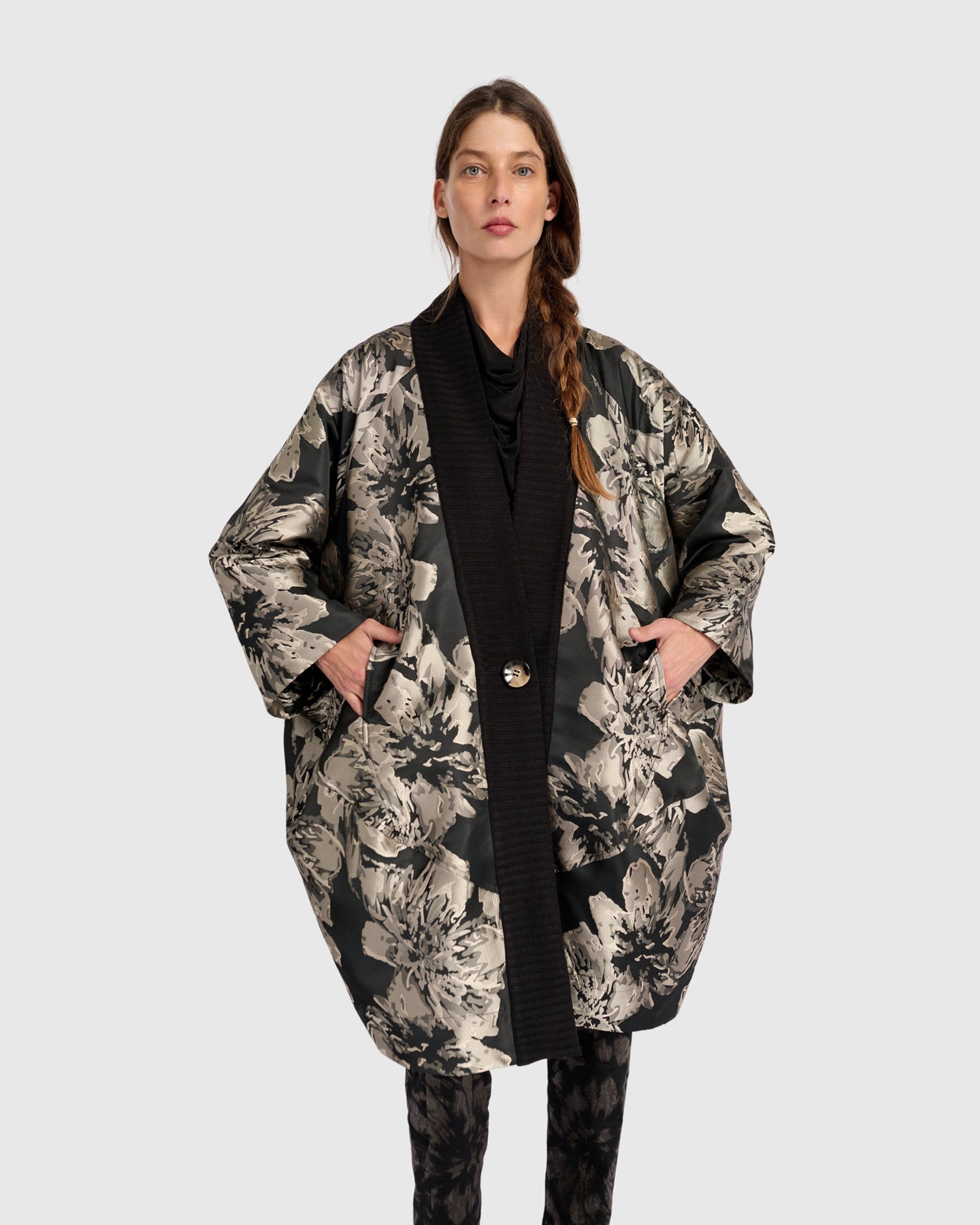 Fine brocade delivers drama with a metallic shimmer that shifts in the light. The boxy cocoon silhouette tapers gently at the hem for modern volume that feels wearable. Ribbed shawl lapels frame the neckline while a single-button closure defines the waist. Welt pockets enhance utility.