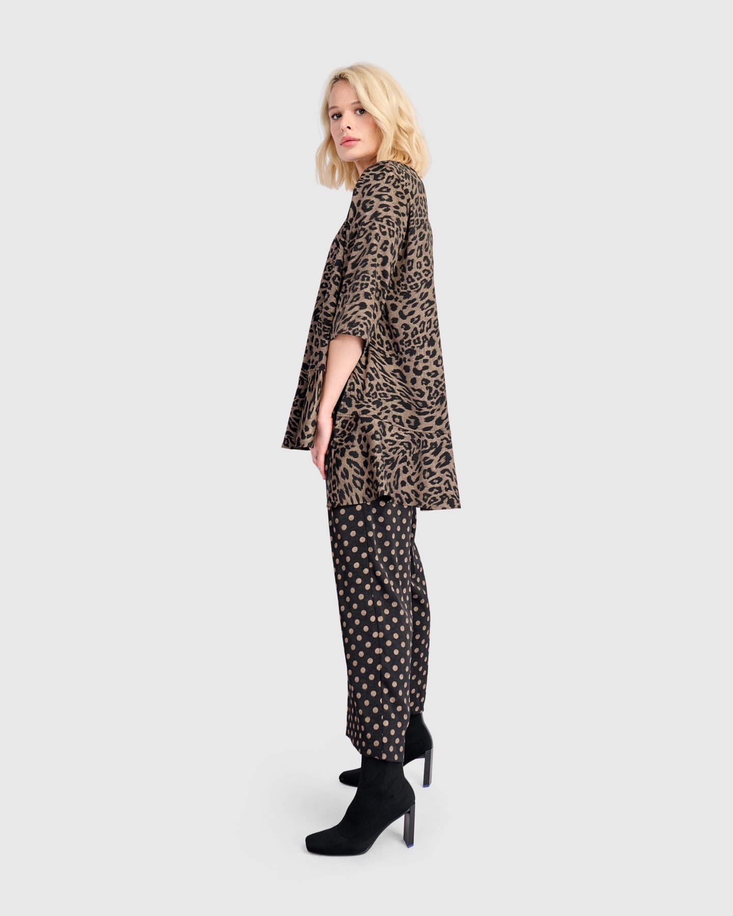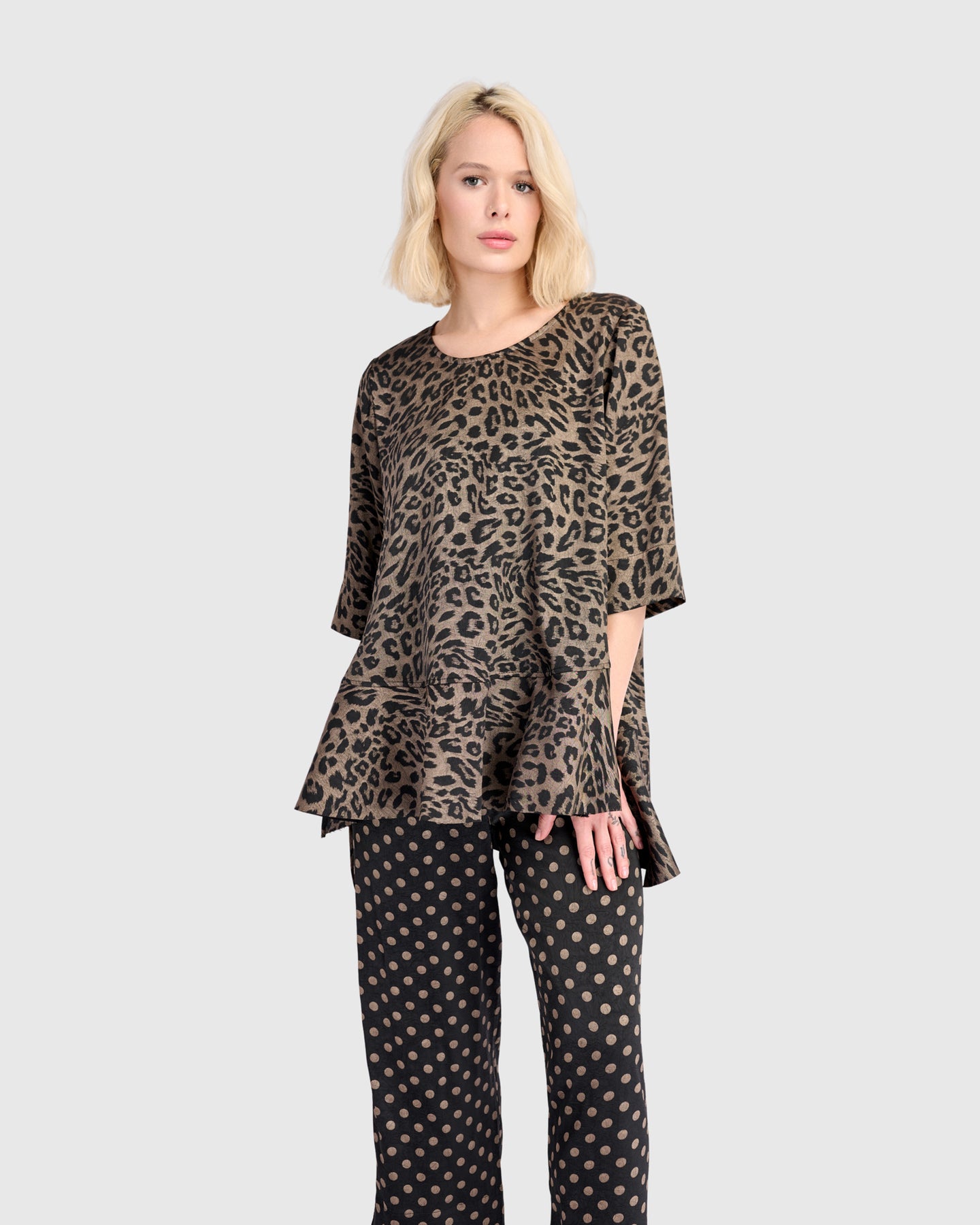 A swingy top with playful flair and ease. The A-line silhouette flows gently away from the body, enhanced by a subtly flared hem and breezy side slits. It's finished with a soft boatneck, 3/4 sleeves, and raw edges that bring a refined undone finish. The leopard print adds bold yet wearable energy.