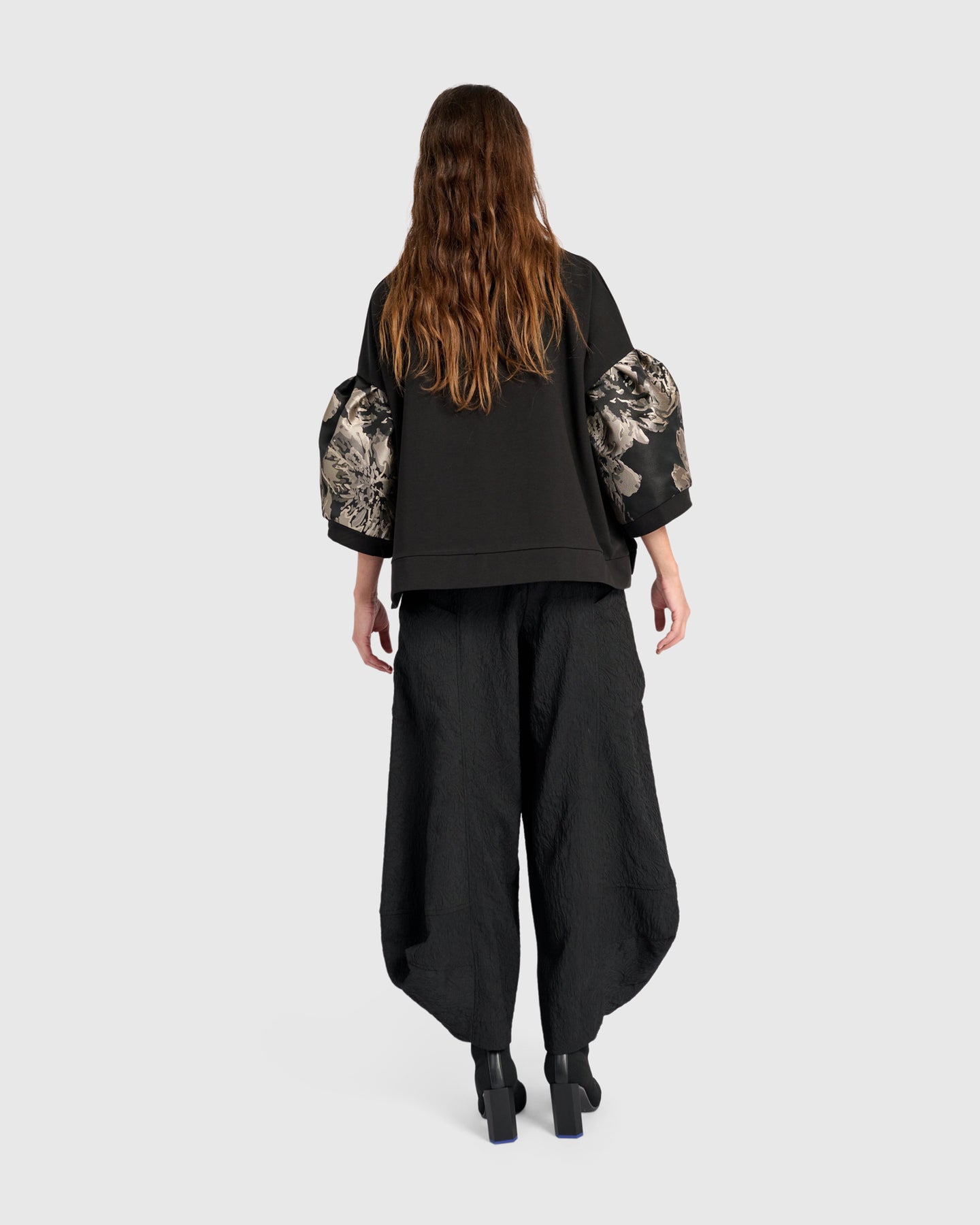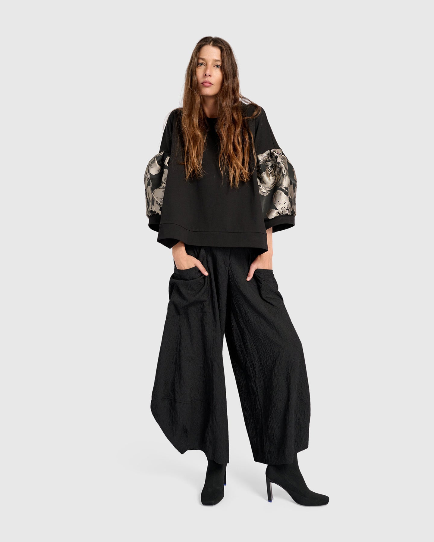 Feminine and bold, this generous pullover plays with proportion using dramatic puff sleeves. A brocade finish on the arms elevates the look while the cotton-rich body keeps it grounded in comfort. A standout top with artful flair.