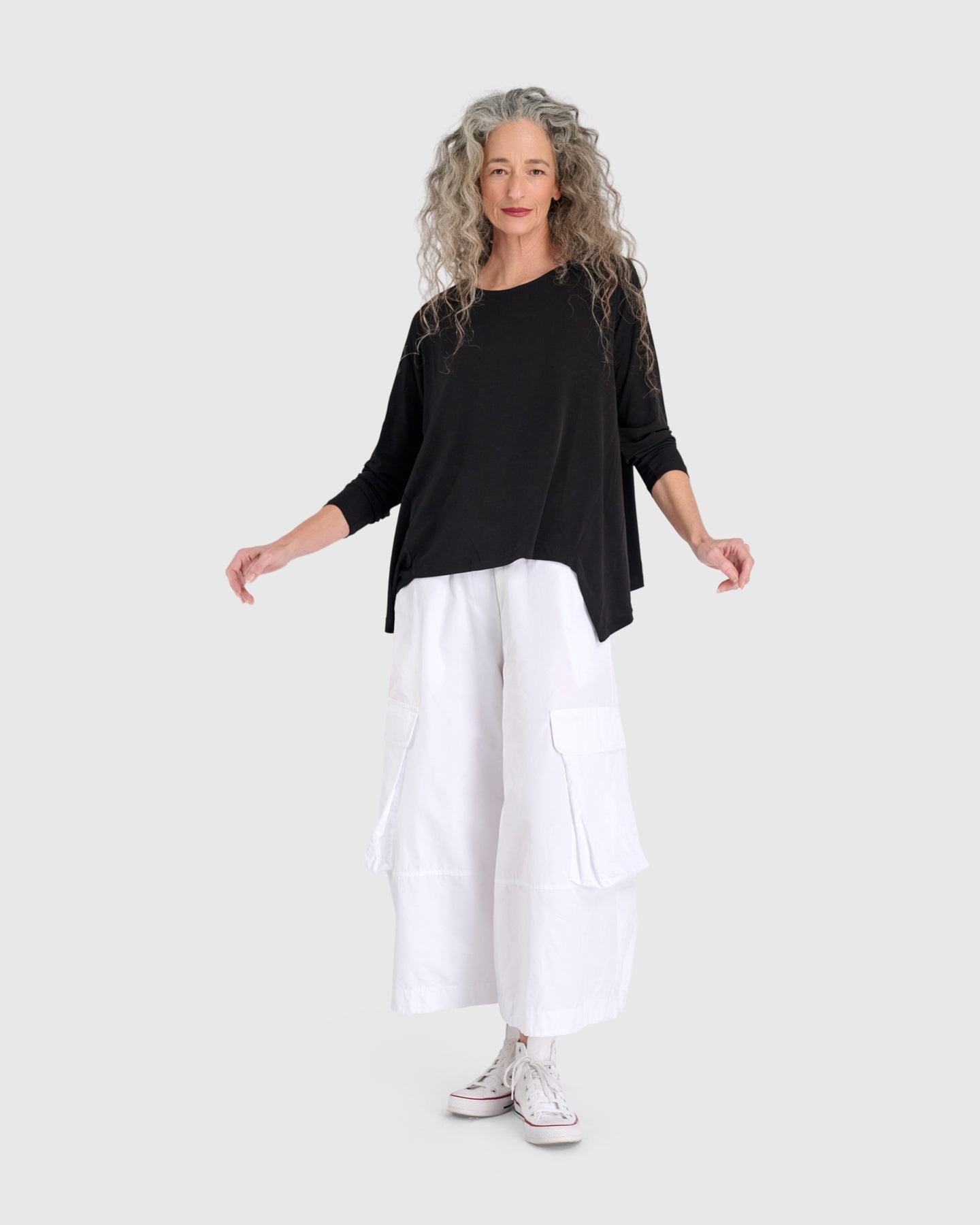 What do you buy the girl who has everything? The ultimate top that's right for any occasion. This silky pullover has a scoop neck, set in sleeves and an asymmetrical panel on the side. The hem has a cut out in the front and is longer in the back. This ultimate top goes with just about everything. Pair with casual leggings for a walk to the mailbox or with your fancy punto pants for that VIP cocktail party.