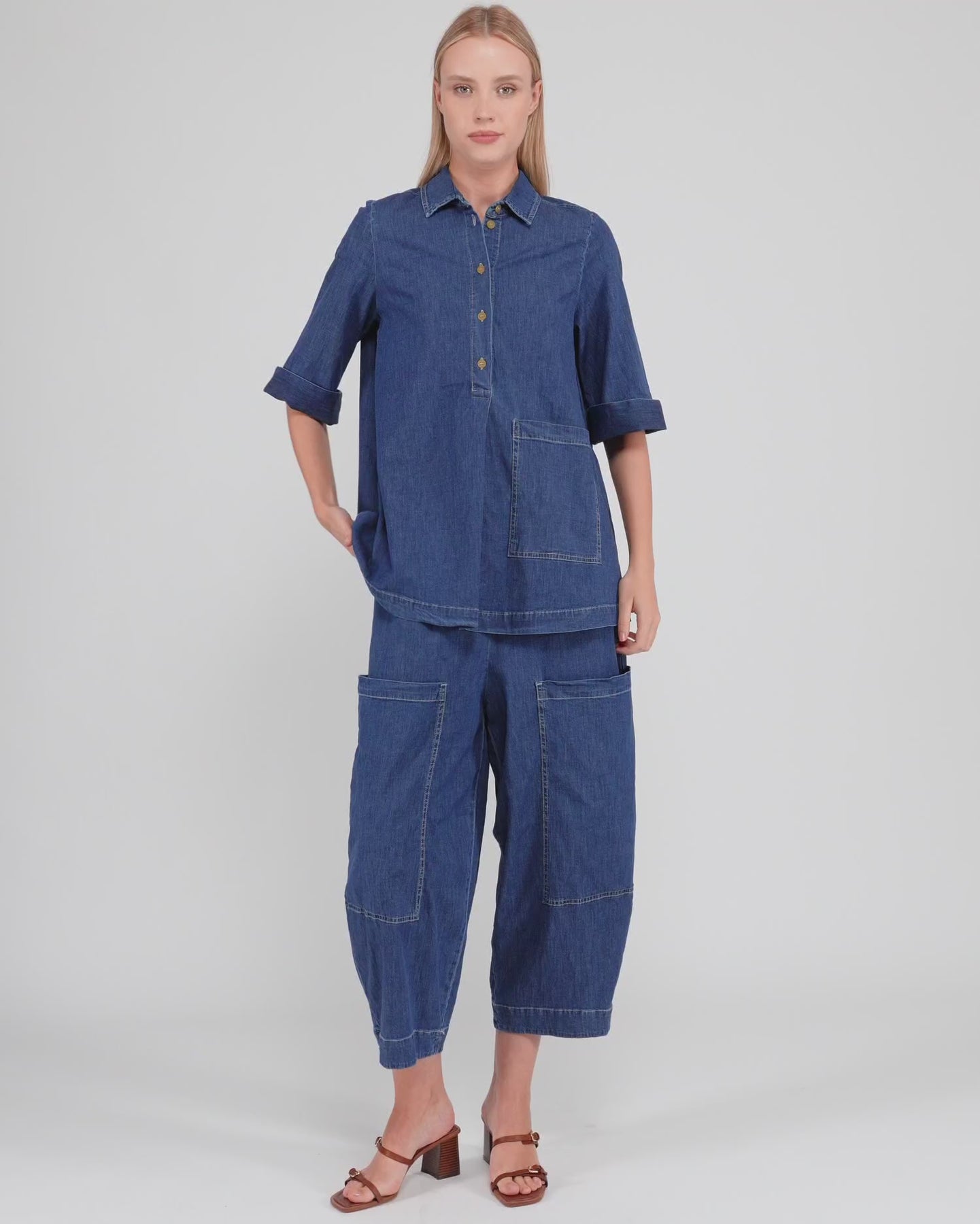 A fresh take on casual denim, these cropped barrel pants are designed with bold proportions in mind. The high-rise waist fits true while the voluminous leg adds a modern, sculptural feel. Extra-large patch pockets and soft stretch denim enhance their laid-back utility. Pair with tucked-in tops or oversized knits for balanced shape.