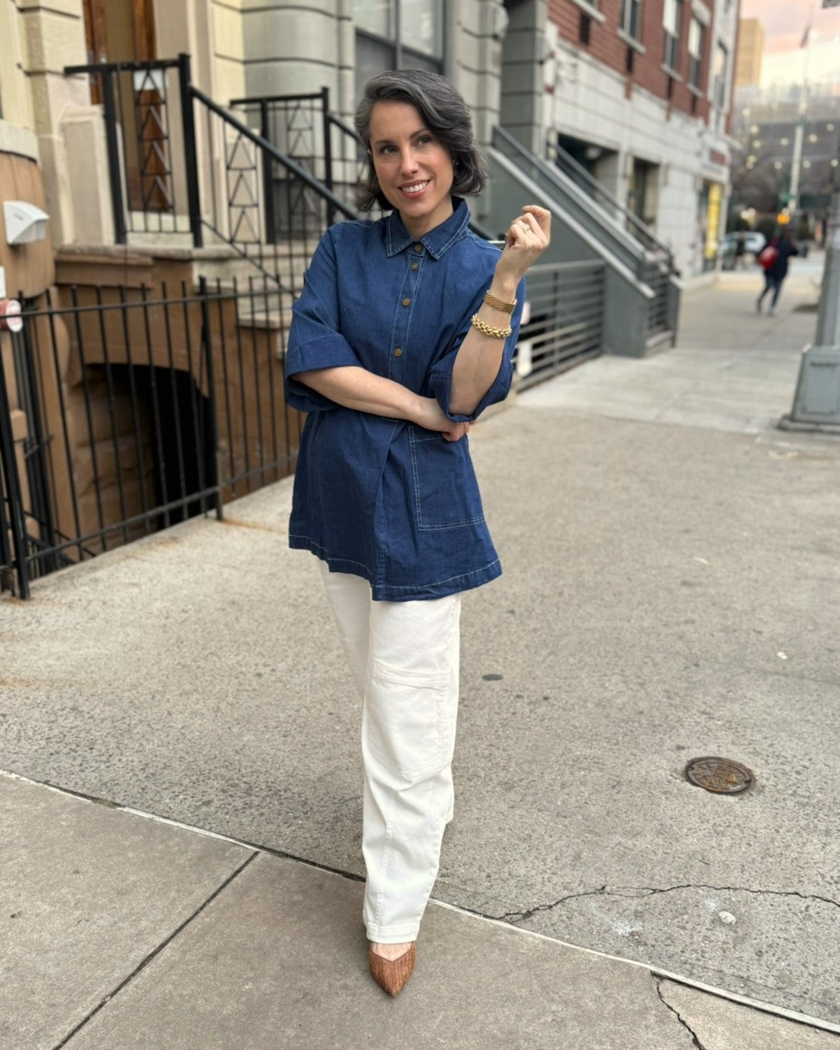 This denim popover shirt is a smart staple with subtle swing. The A-line cut skims gently over the hips, while 3/4 sleeves and a crisp collar lend balance and structure. Crafted in lightweight stretch cotton, it features a single patch pocket for a modern utility touch. Easy to tuck, layer, or wear loose over wide-leg pants.