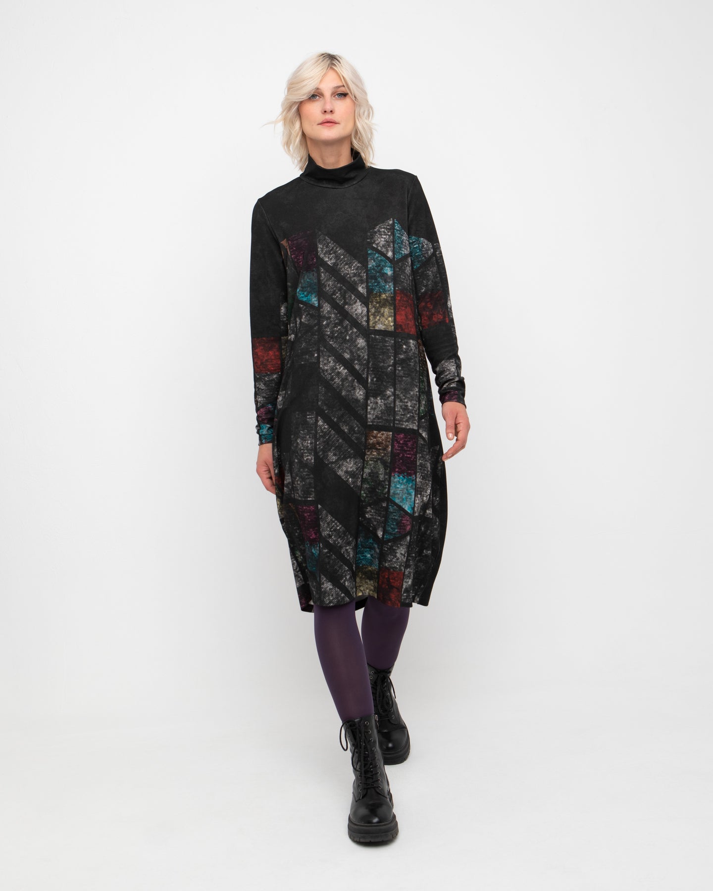 The Geode Dress brings bold visual interest to a cocoon silhouette that's both modern and flattering. Cut to skim the bust and drape gently through the body, it features a structured stretch jersey and artful scale-print front. Finished with a mockneck, practical pockets, and contrasting gray back panel for dimensional appeal.