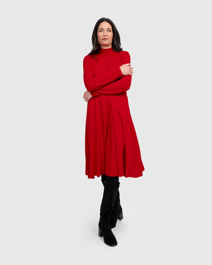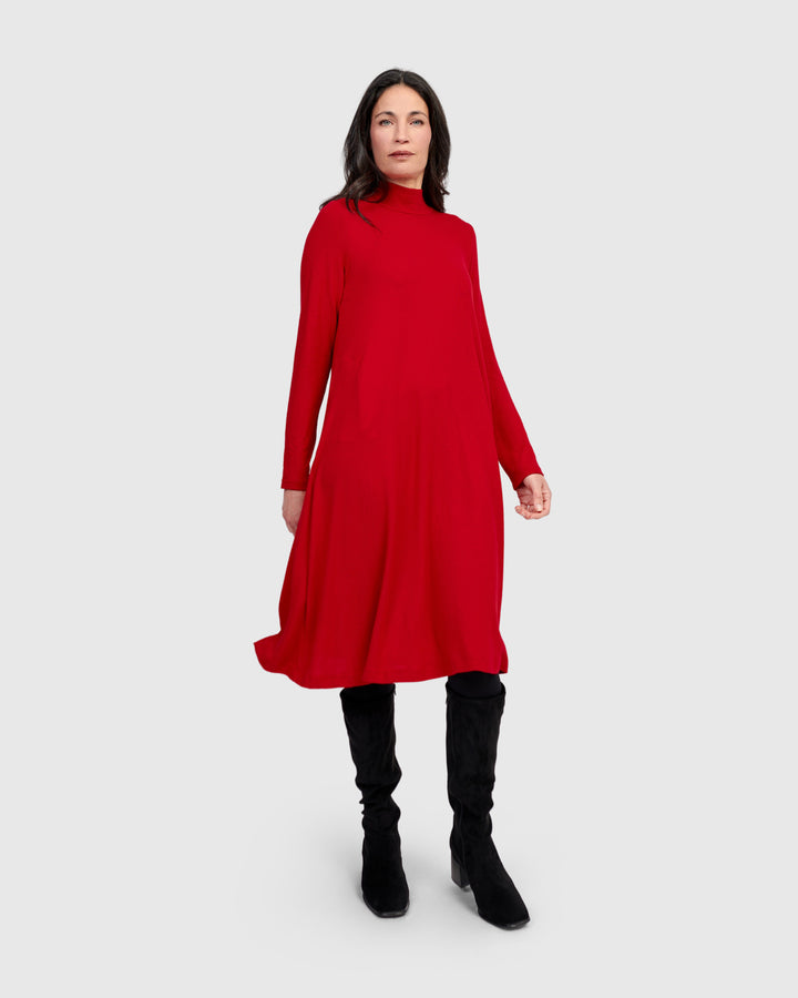 A sleek A-line with soft structure, this mockneck dress is crafted in a lightweight sweater knit that layers beautifully or stands alone. Tapered through the bust with gentle flare through the body, it skims just below the knee with a fluid, swingy shape and discreet side pockets for utility.