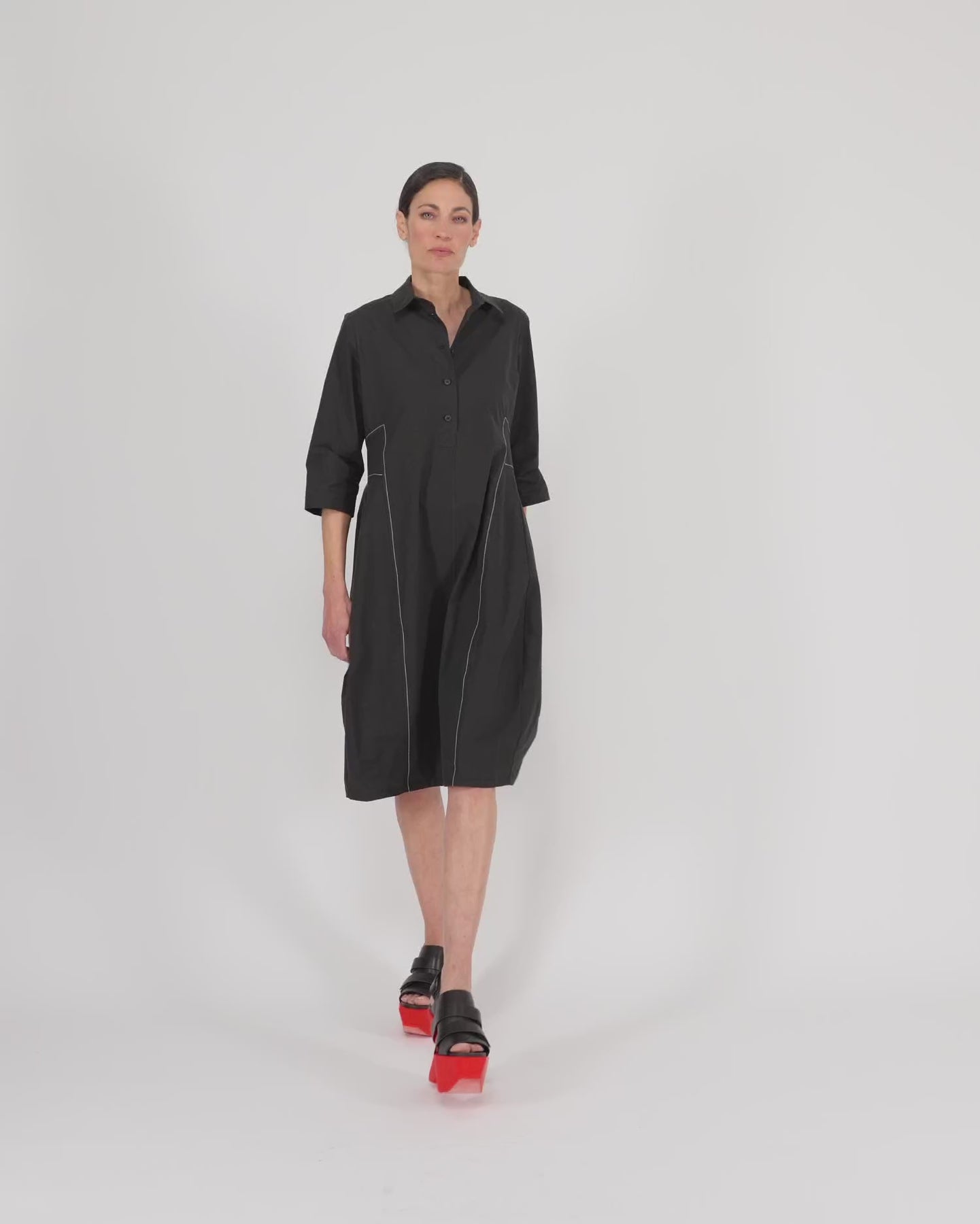 This knee-length dress features a refined cocoon shape that skims the upper body before relaxing through the skirt. The washed cotton fabric feels soft and breathable, while thoughtful seaming enhances the silhouette. Finished with side pockets and a clean button placket, it's an easy everyday option with polished appeal.