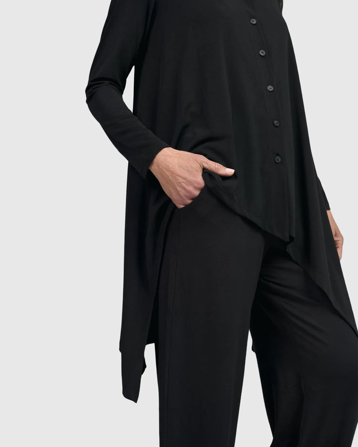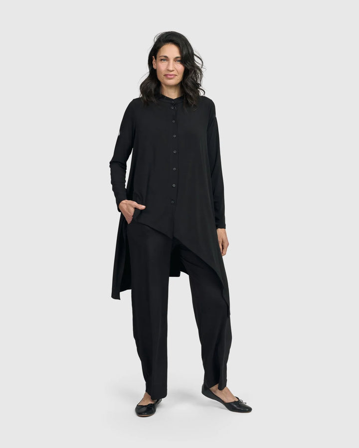 Practical magic is how we'd describe this button down hi-lo cardigan that can be worn as a top or open as a jacket. Low Mandarin-style collar, buttons down the front, set in sleeves, no pockets for a smooth silhouette. Tapered draped fabric from below the bust down to the hem gives it a dressy flair. You'll be in awe how many uses you get out of this one!