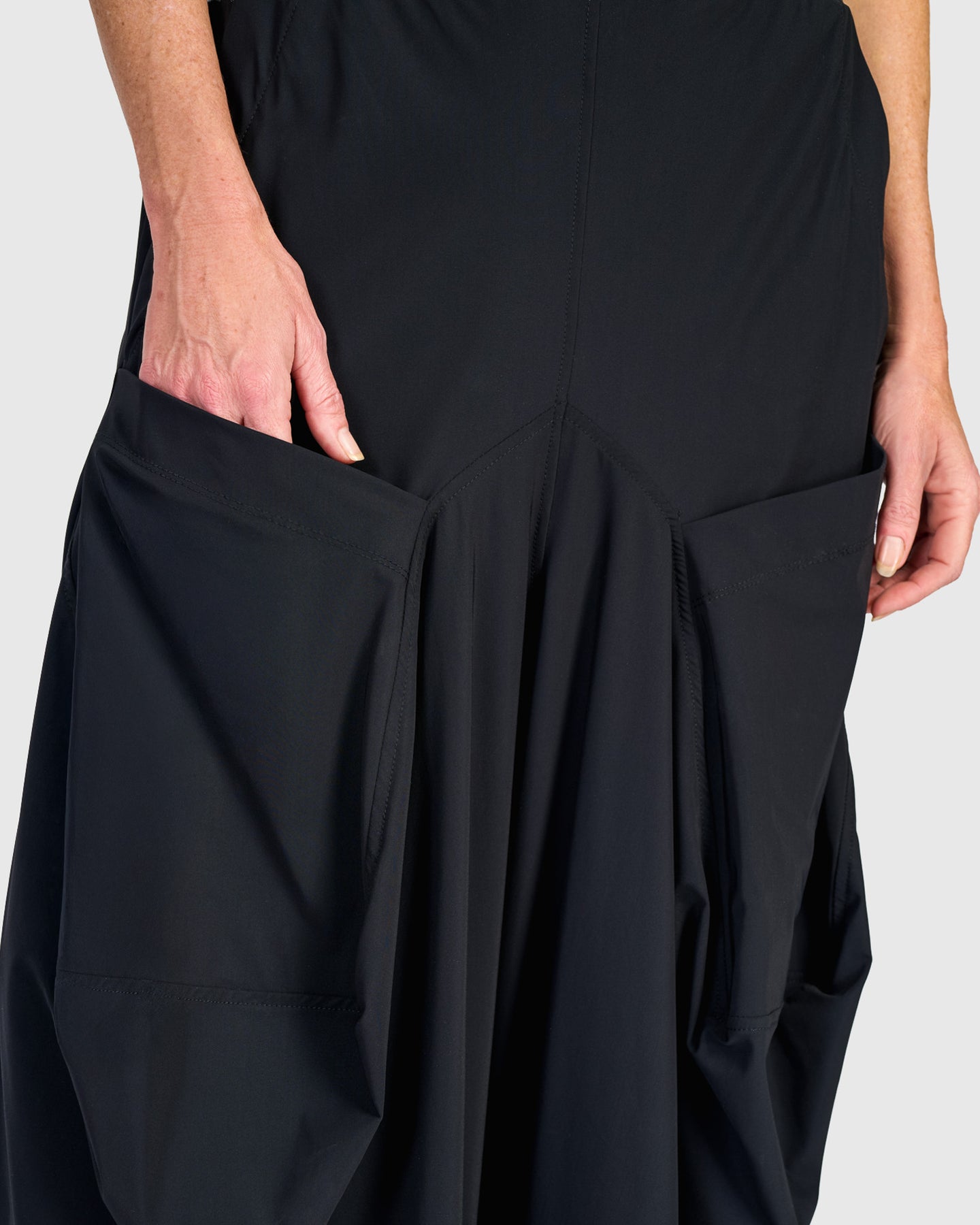 These cropped harem pants balance a neat high waist with an oversized leg and slightly dropped crotch for volume that still feels controlled. Draped patch pockets emphasize the silhouette without adding stiffness. In smooth stretch techno knit, they are breathable, wrinkle resistant, and easy to wear, making them a strong black pant option for travel, everyday dressing, and modern layered looks.