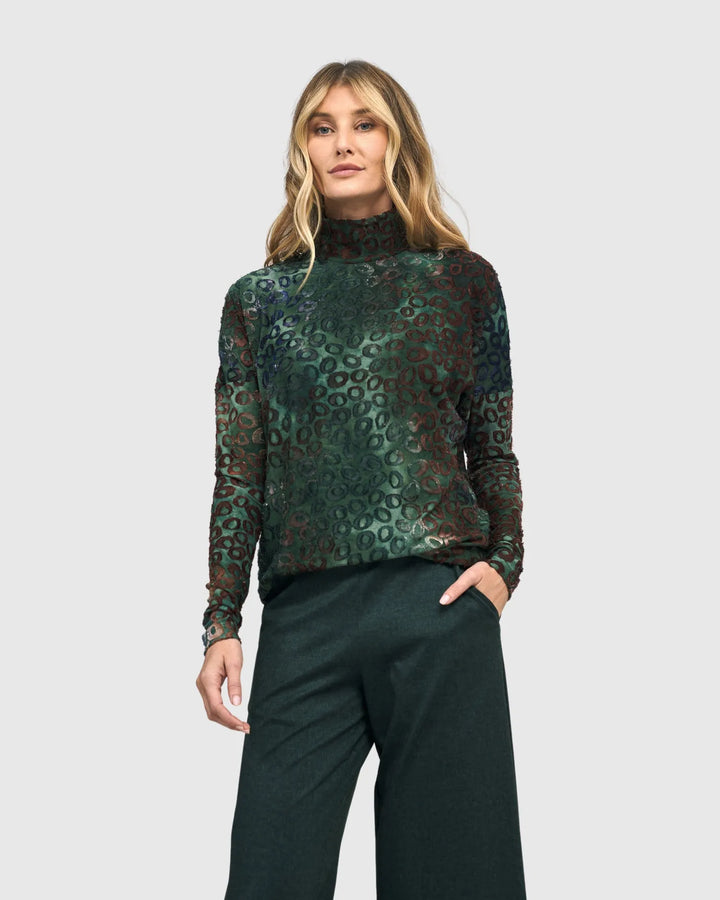 A layerable turtleneck that can be styled two ways! It has drop shoulder long sleeves and a relaxed silhouette. It sits loose at the bust and tapers in at the hem. Comfortably crafted in a soft, stretchy burnout lightweight fabric with soft circle pattern detailing, it almost looks like velour from far away. It's long enough to wear like a fitted tunic or can be tucked in at the hips for a more relaxed look.