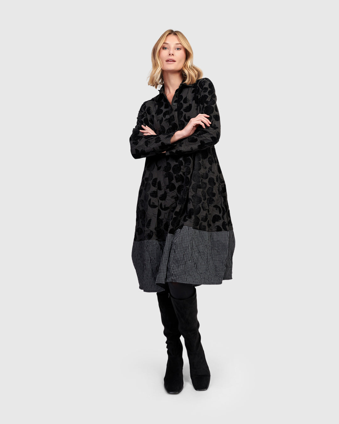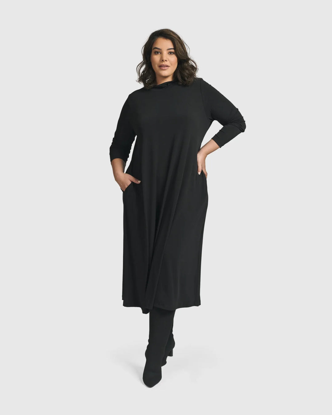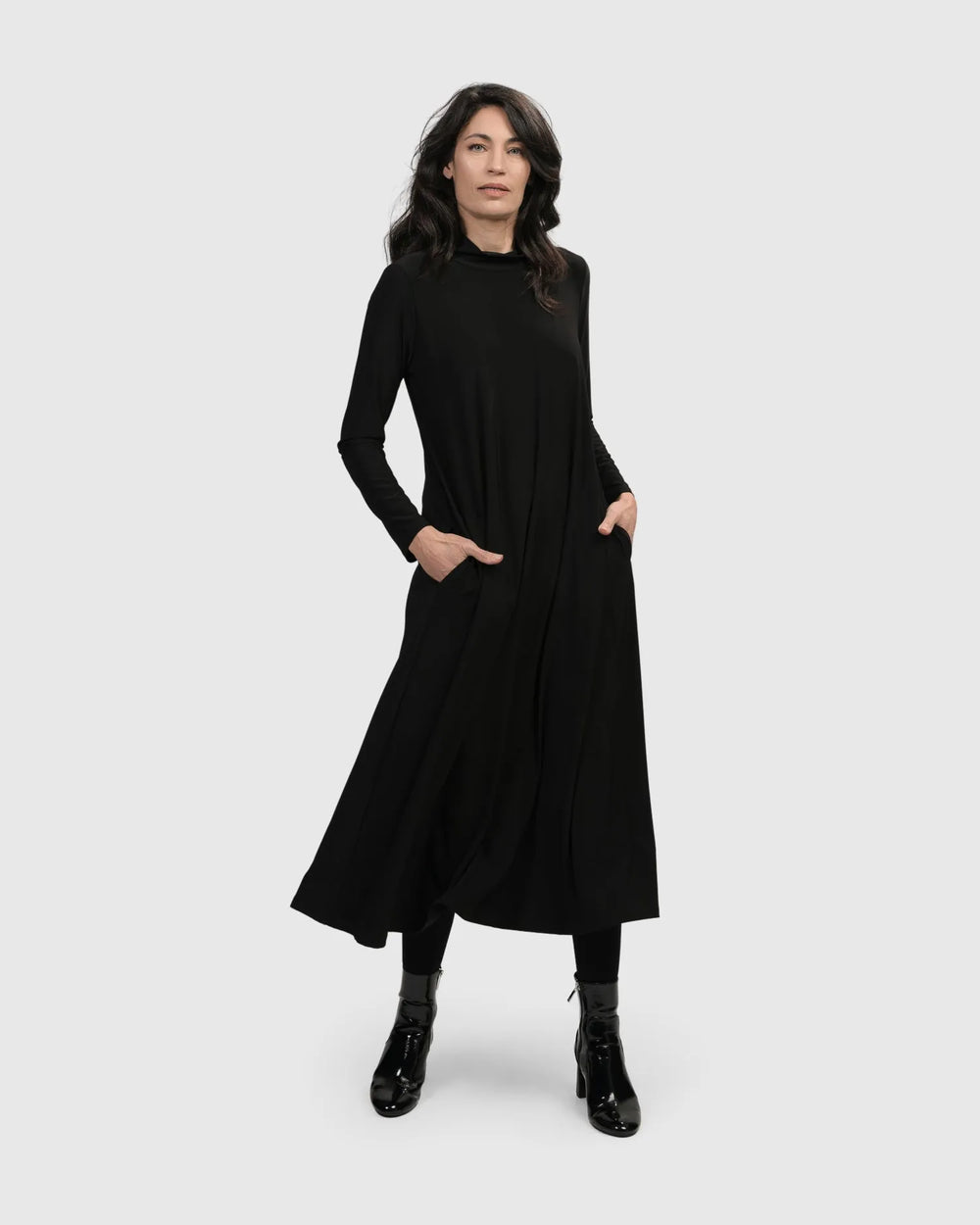 This sculptural knit dress delivers effortless structure with a clever mix of textures. Soft jersey through the body and ribbed quilting panels at front and back for subtle dimension. The funnel neck adds a refined touch, while the fluid A-line cut finishes in a lightly flared hem with slits for ease. A versatile wardrobe staple that moves with you, designed for polished comfort.