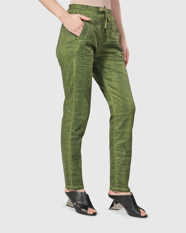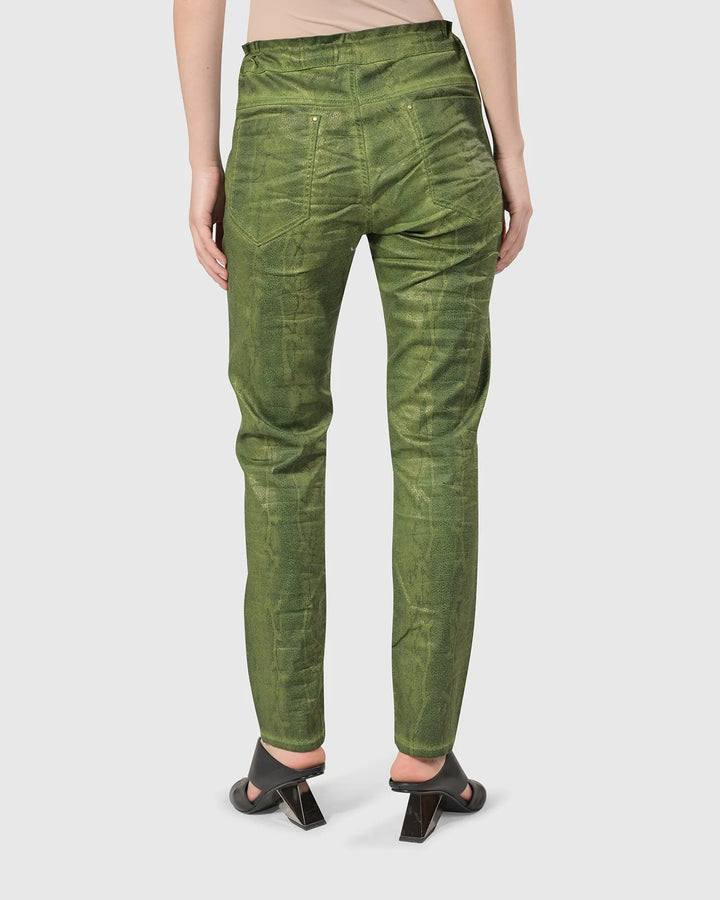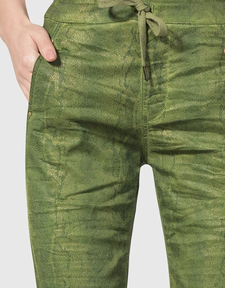 Daredevil Debbi wore our gorgeously comfortable jeans skydiving! A subtle gold and black micro leopard print adds shimmer and animal magnetism to our must-have Iconic Jeans. Cut with a more relaxed taper than skinny jeans, with an adjustable drawstring for breathing room when you need it. Ultra-soft stretch cotton with creasing, mock fly, side pockets, yoked back with patch pockets, and rivet trim.