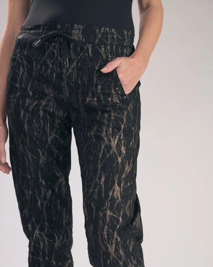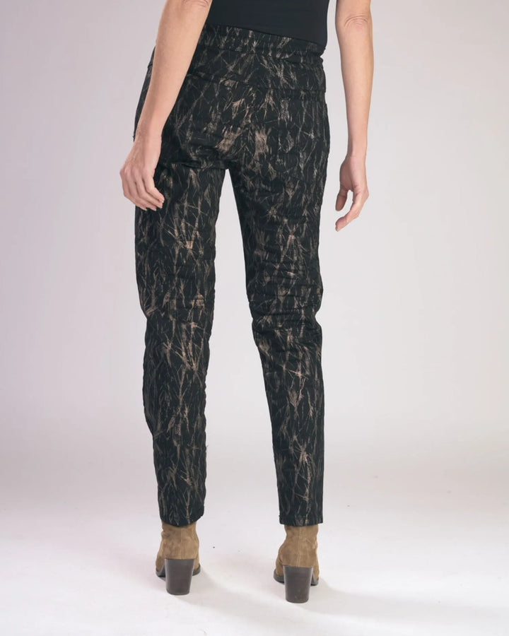 A generous dose of metallic sheen adds downtown edge to our cult favorites in ultra-soft stretch cotton for an amazing fit! With a flattering mid-rise waist and more relaxed taper than standard-issue skinny jeans, these addictive pants never feel skin-tight. Drawstring stretch waist, mock fly, angled side pockets, and yoked back with patch pockets. Finished with rivet trim.