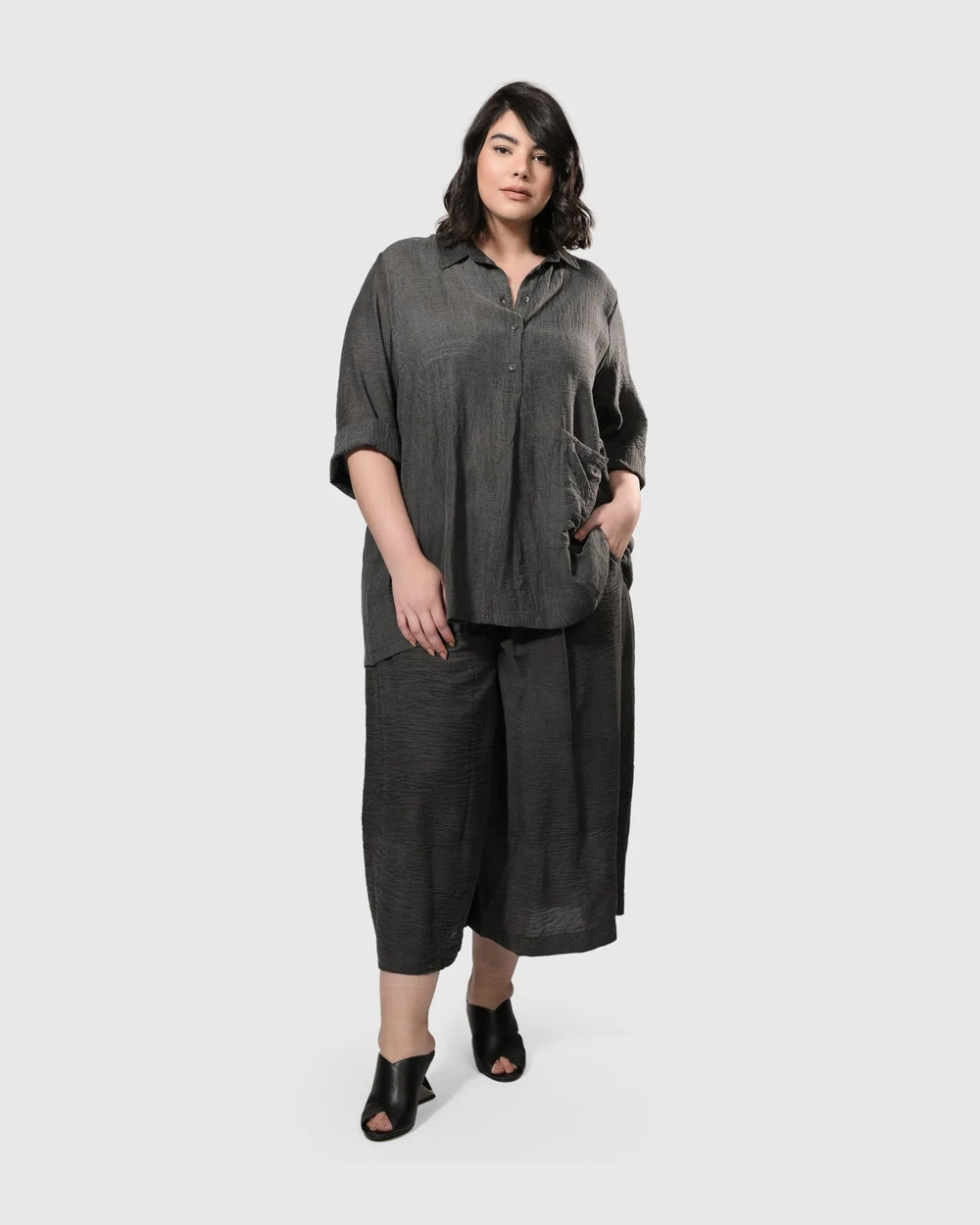 Finely woven for an ultra-soft hand and beautifully tailored for a flattering fit. Pullover style with spread collar, drop shoulders, cuffed elbow sleeves and button placket with inverted pleat detail. Finished with draped patch pocket and straight hem.