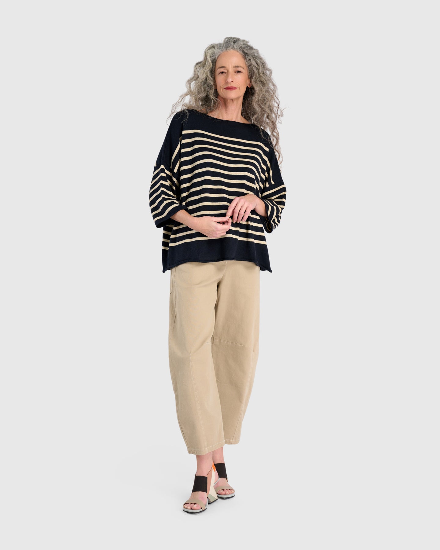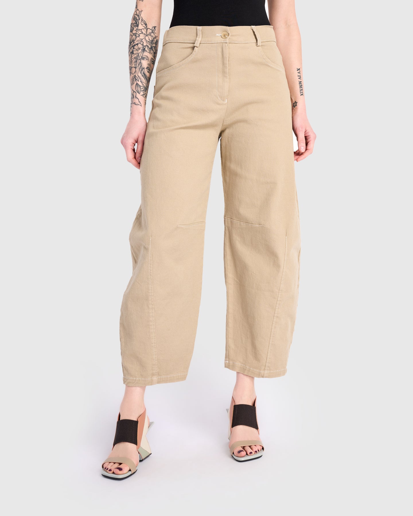 A fresh neutral for daily wear, these sand-colored barrel pants are the definition of easy polish. The stretch-twill fabric moves with you, while the high-rise silhouette and tapered hem create clean, contemporary lines. Thoughtfully finished with pockets and a classic fly front, they deliver both comfort and versatility.