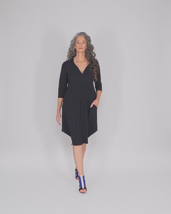 It's just one of those dresses—dependable wherever you wear it—with kicks or heels. Cut from our exclusive (and comfy!) TECHNO knit that wicks sweat, won't pill, resists wrinkles and travels well, too. Collared V-neck pullover with three-quarter sleeves, signature draped pockets, elastic drawstring pulls at the architectural hem and back of dress for a touch of creative edge.