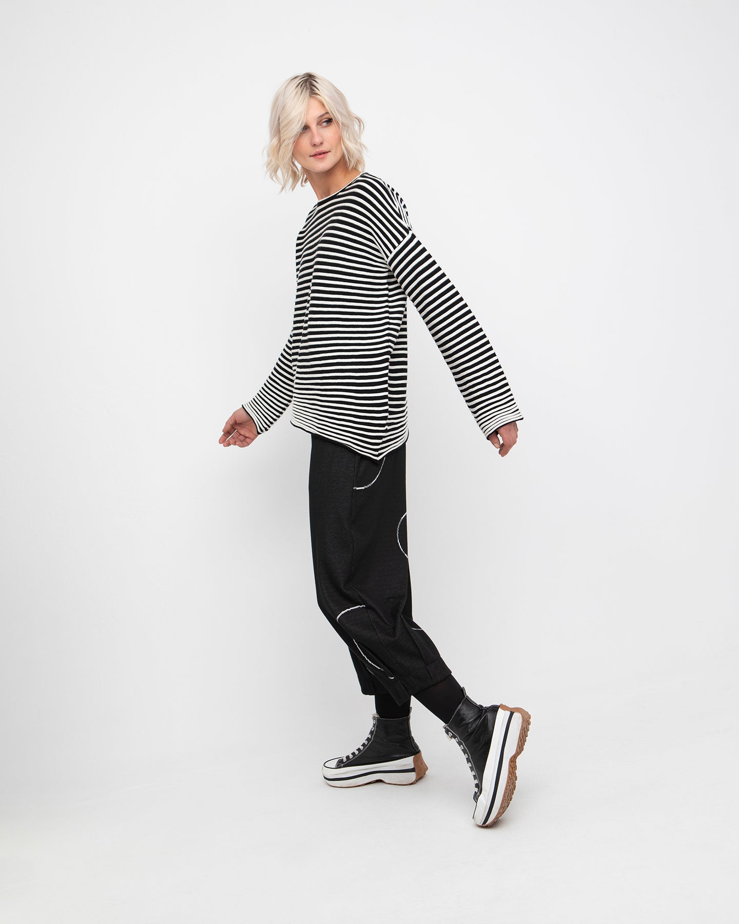 Statement stripes meet fluid drape in the Magnitis Sweater, designed with a relaxed shape and asymmetrical hem that falls to the upper thigh. The lantern-shaped sleeves are extra long and softly sculptural, while the ribbed texture adds dimension to the lightweight knit. A modern layering piece with subtle structure and playful proportion.
