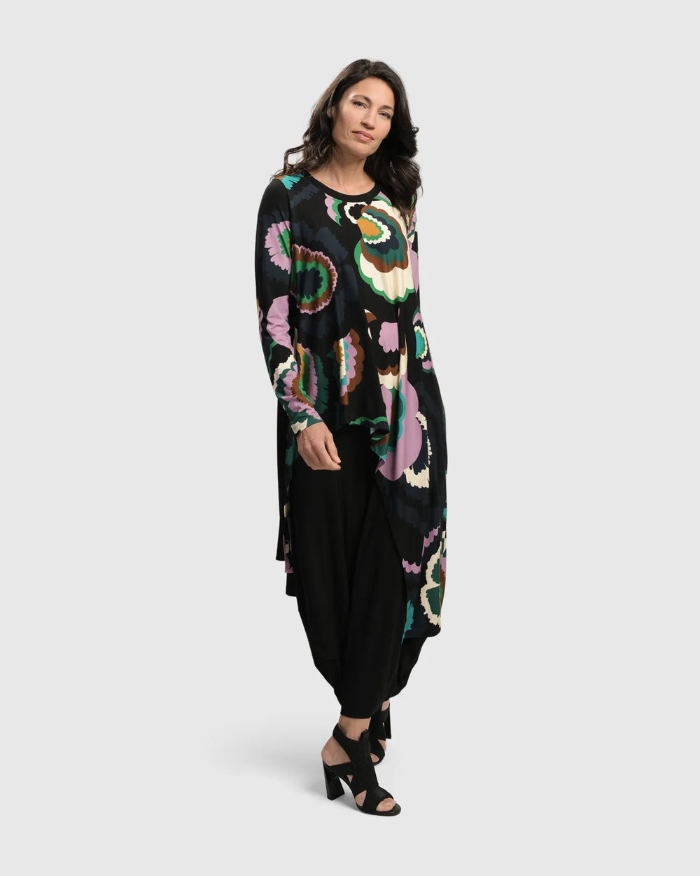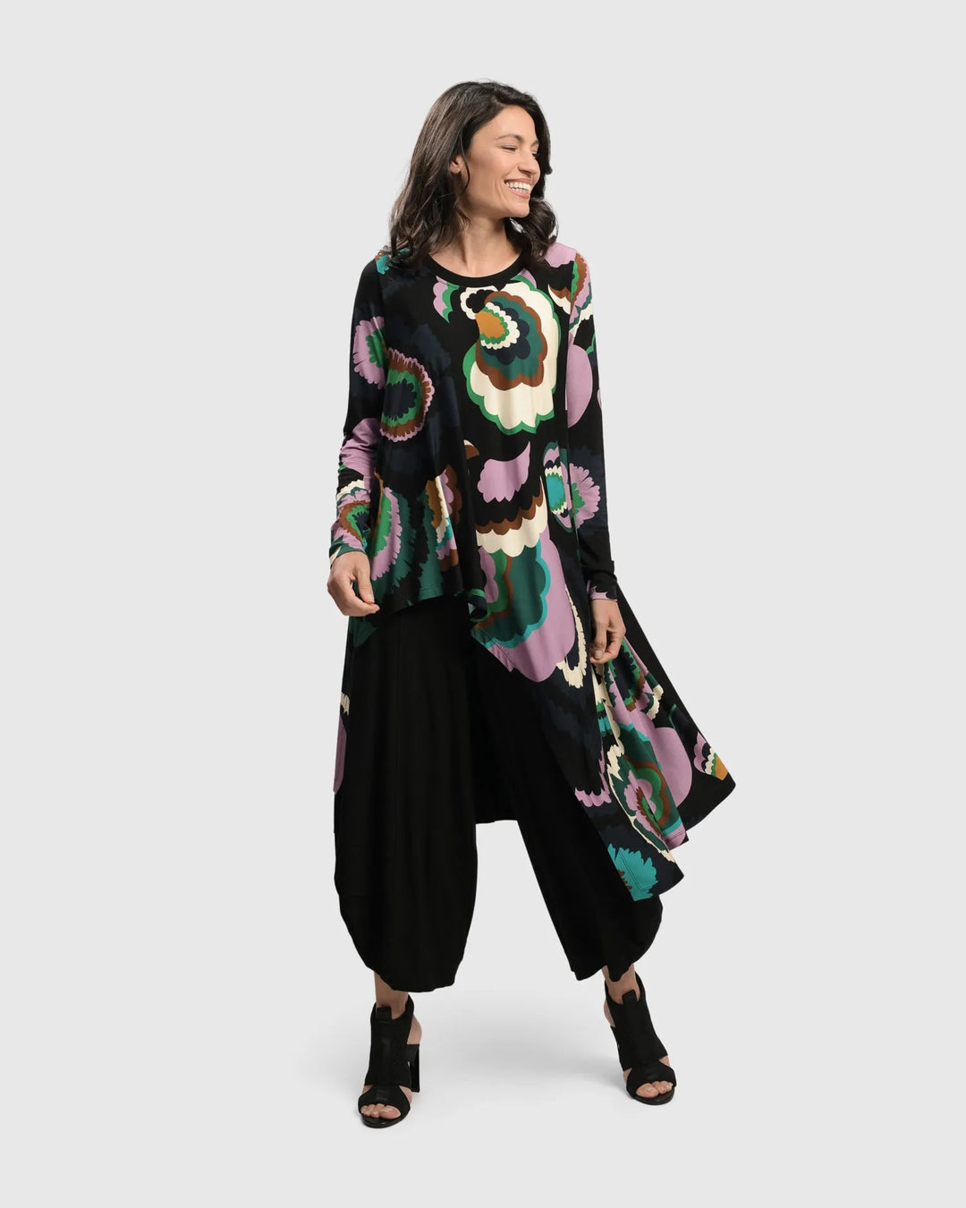 An Alembika favorite, reimagined in a striking Matrix print. This bestselling v-neck top features a softly flared A-line shape that skims the waist and hips, flattering a range of body types. The slinky knit drapes beautifully, with bracelet-length sleeves and a reinforced neckline for structure.