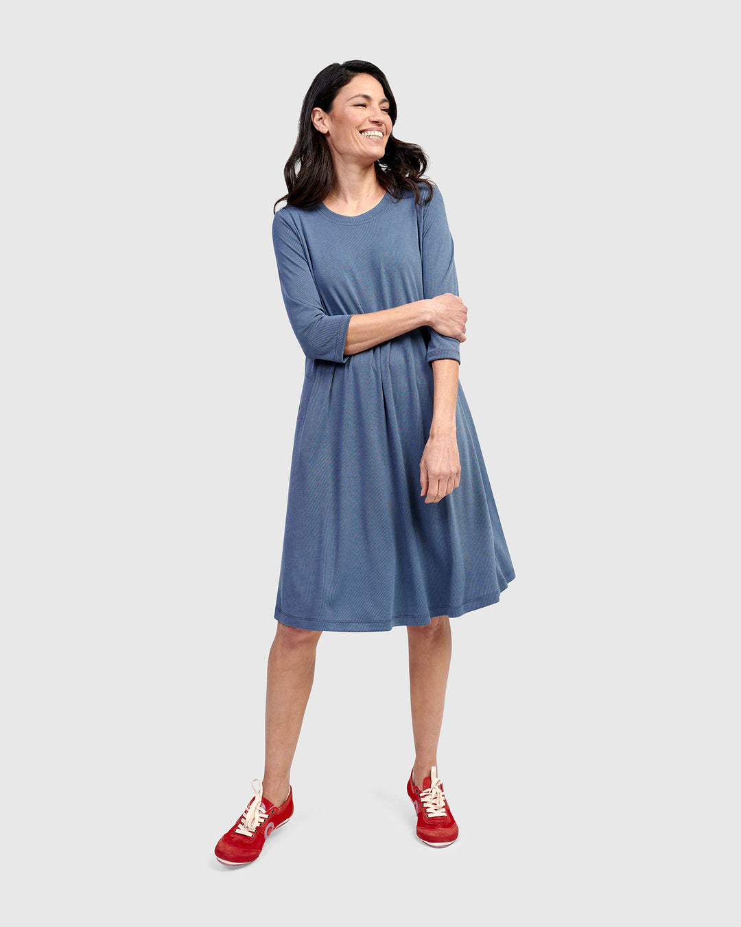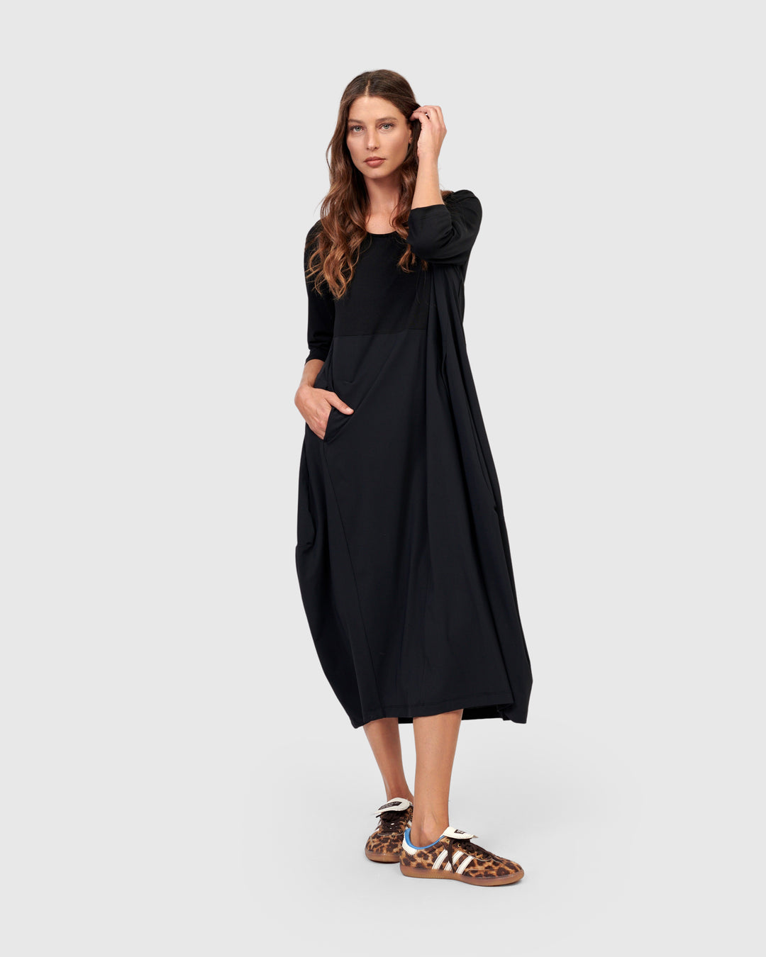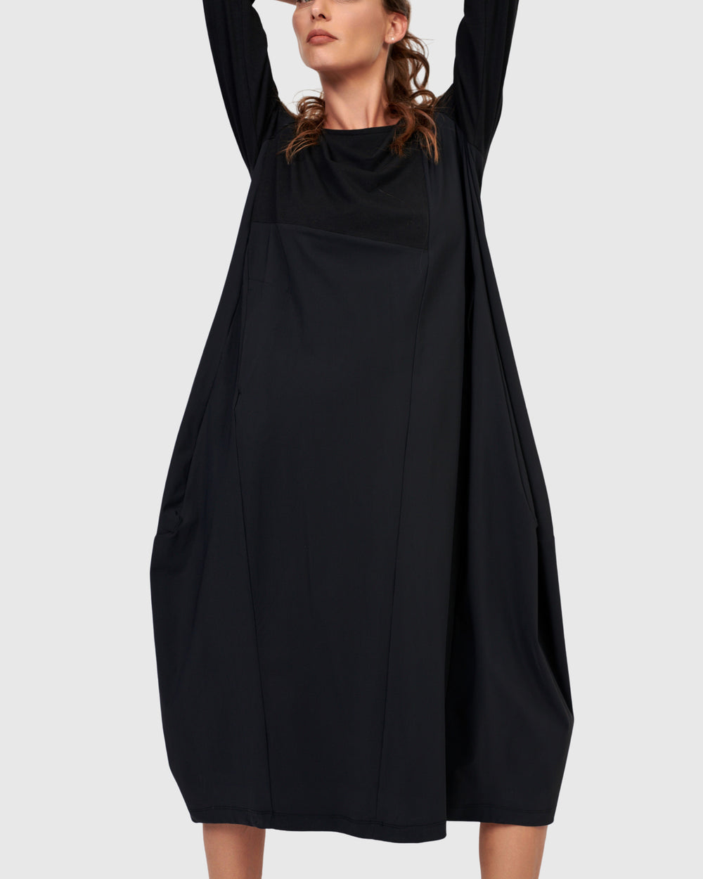The Essential Slinky A-line Dress in Black is a foundational piece crafted in fluid matte jersey for graceful movement. It skims the shoulders and bust before releasing into a flowing A-line shape that flatters every silhouette. Designed with a sleek mock neck, long slim sleeves, and discreet side pockets, this versatile maxi dress is effortless to layer or wear solo, balancing comfort and sophistication.