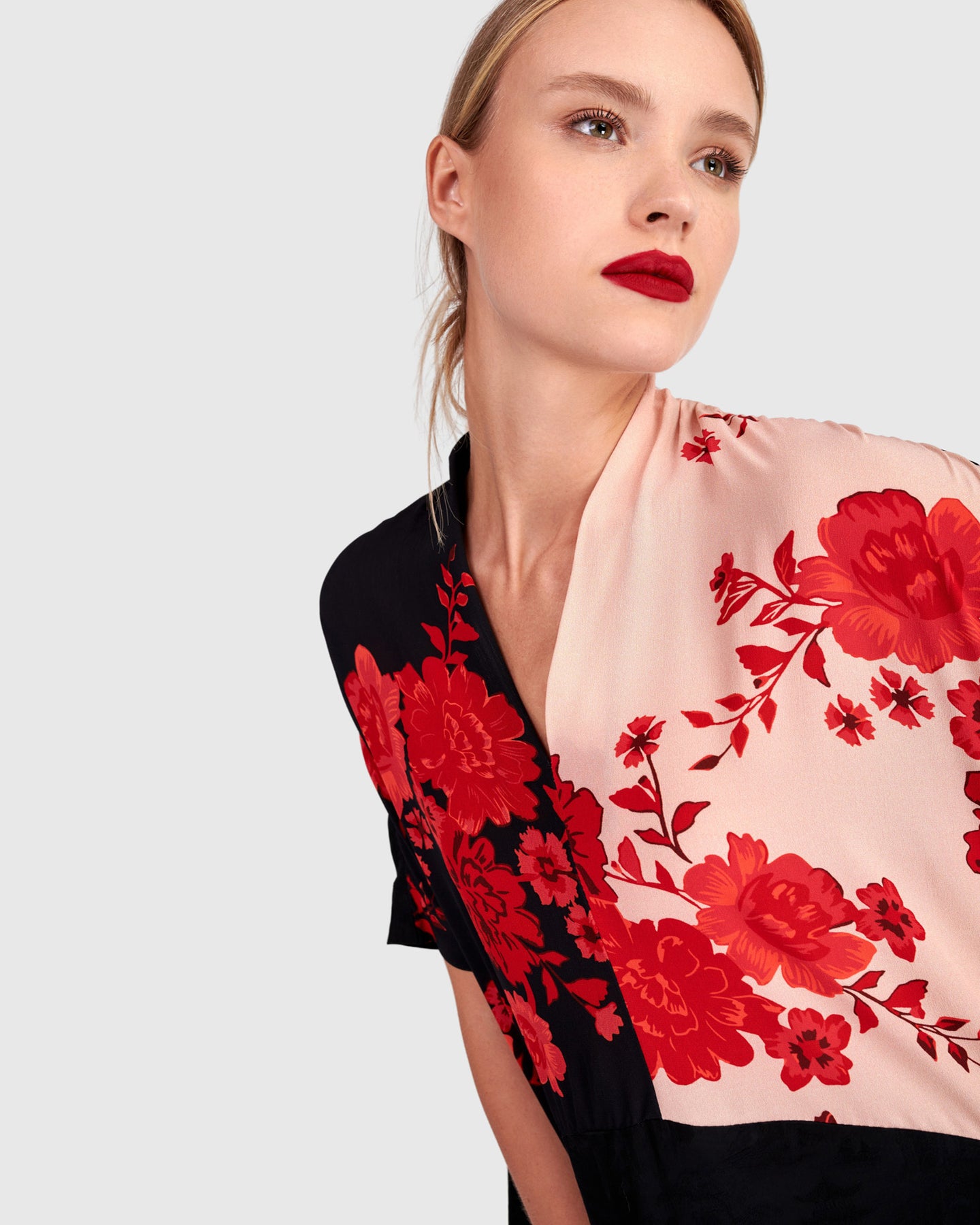 Cut with a fitted shoulder and an easy A-line shape, this midi dress moves fluidly through the body with generous sweep at the hem. Lightweight viscose with a silky hand lends soft drape and breathability, while the subtle pagoda print adds quiet visual texture. Short sleeves keep the line clean and balanced, and side pockets add everyday function to this event-ready dress.