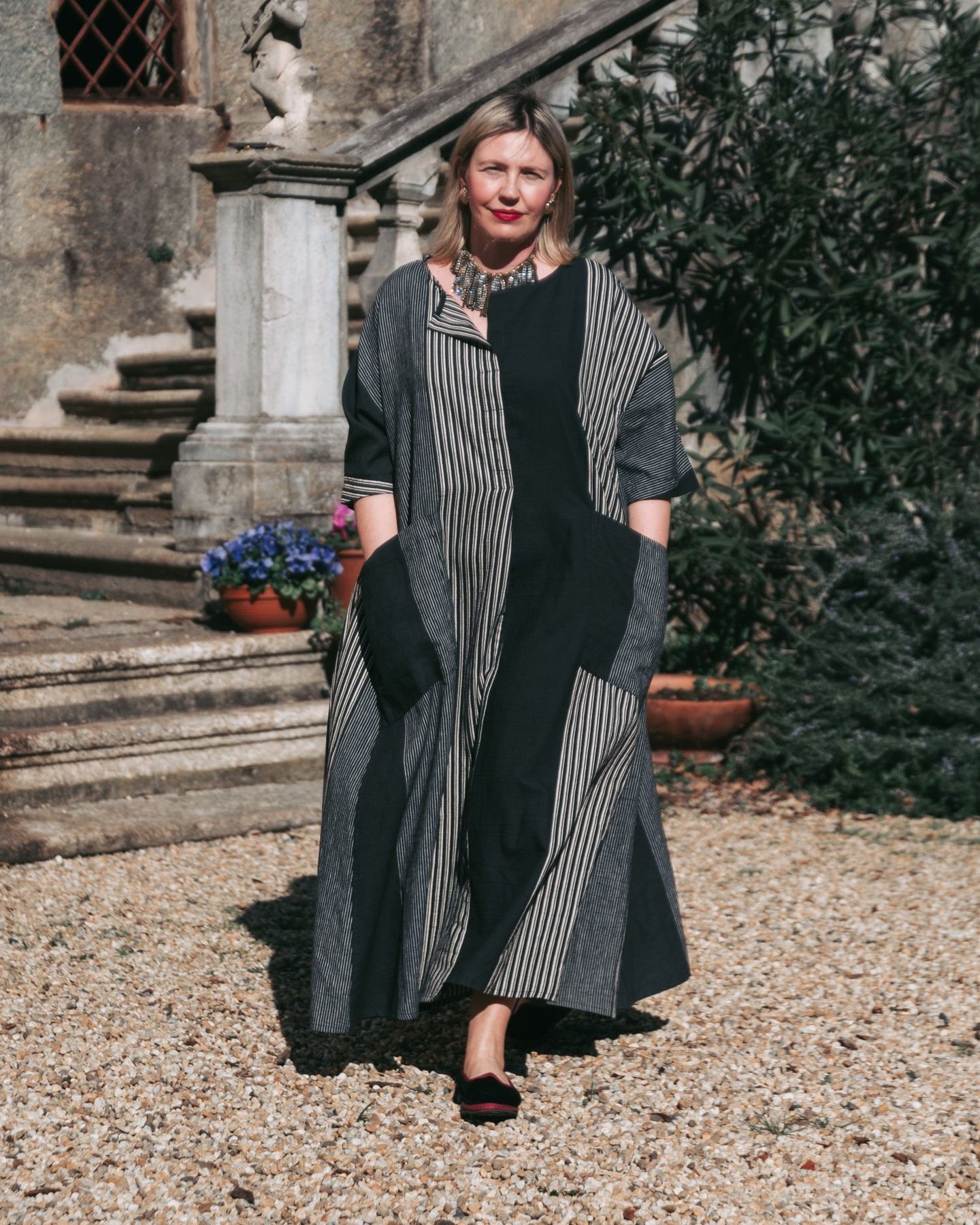Cut with generous volume, this maxi dress offers a relaxed A-line shape that feels airy and unforced. The cotton-linen blend woven fabric keeps it breathable, while dolman sleeves and a split neckline enhance ease of movement. Oversized patch pockets add practicality and visual balance, making this an effortless statement piece for warm days.