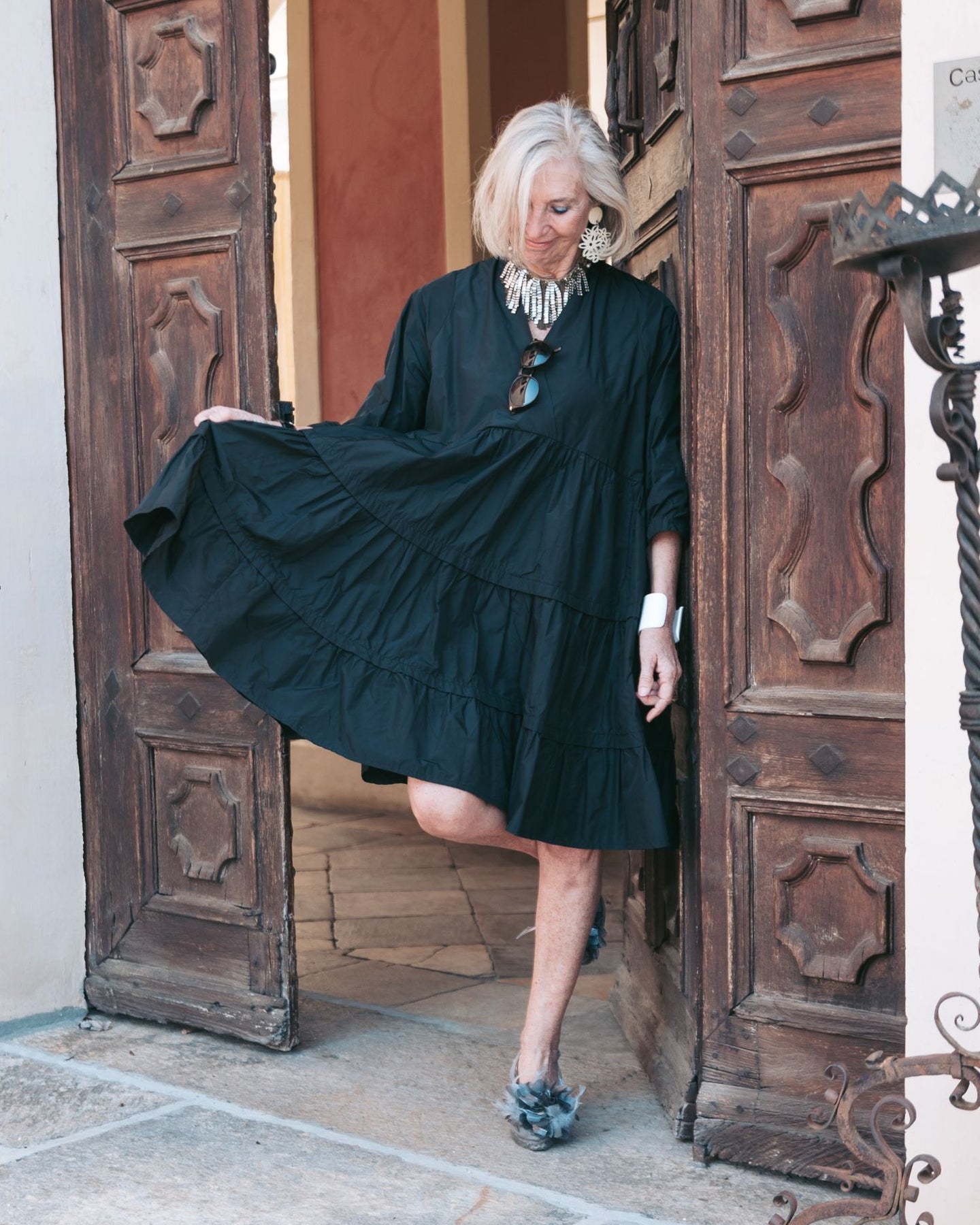 Cut in swishy woven taffeta, this black mini dress delivers light volume with a tiered skirt that moves cleanly as you walk. The relaxed A-line shape falls away from the body for easy comfort, while the overlapping V-neck adds a crisp finish. Wear it as a tunic over slim pants or as a standalone pocket-free statement dress.