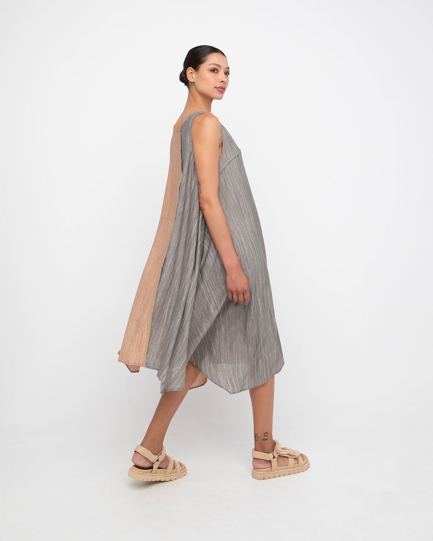 A reversible midi dress with a softly flared shape and generous sweep. The wide neckline and asymmetrical hem create natural movement, while the front-to-back reversible design offers two distinct looks in one. Light colors and textures for a lived-in feel and all-day breathability.