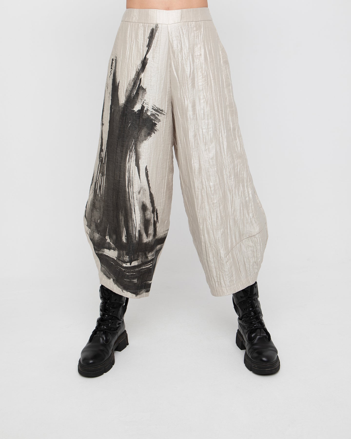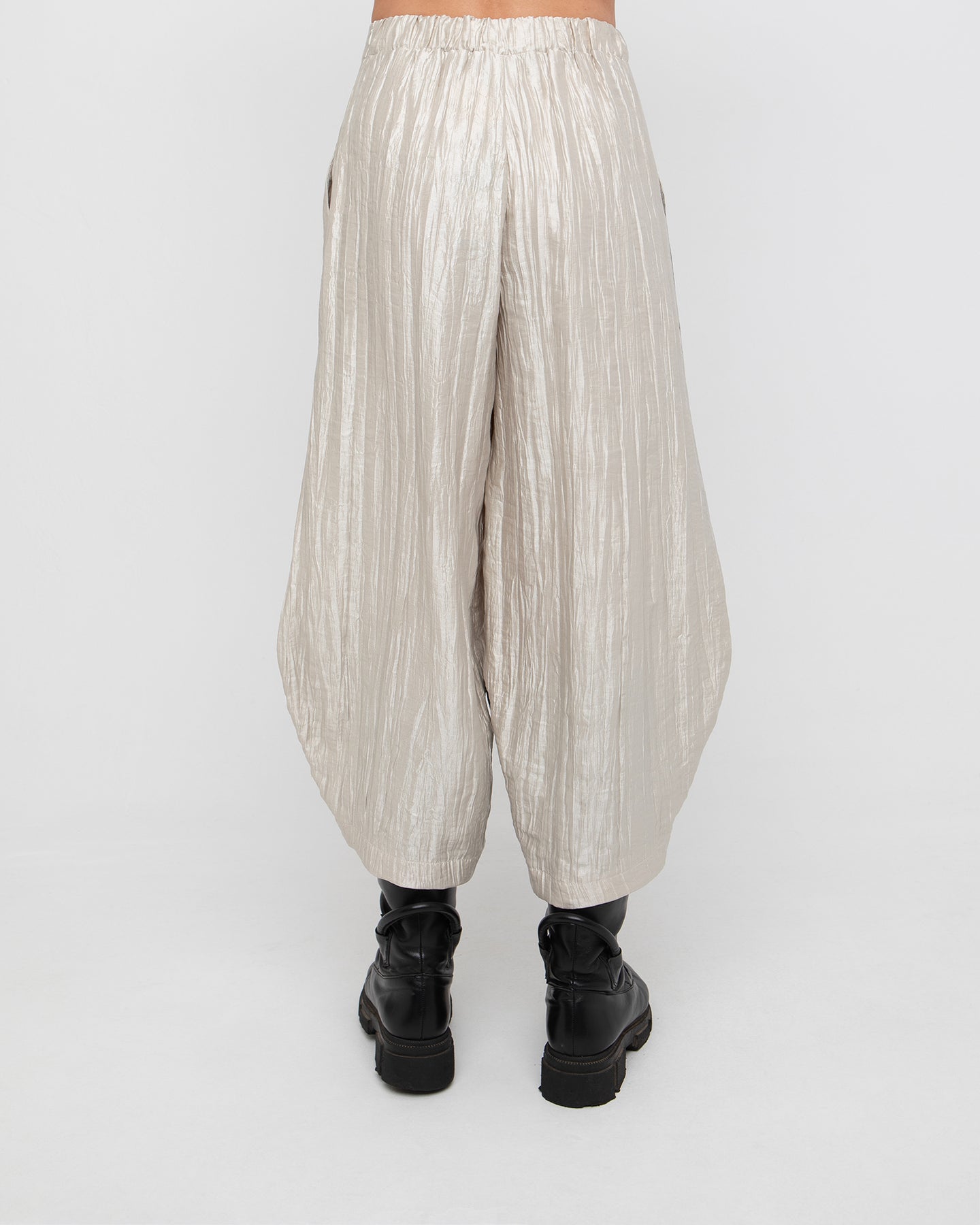 A cropped lantern silhouette with luminous texture, these shimmering trousers deliver relaxed structure with standout presence. Designed to sit high on the waist with an elasticized back and hidden side zip, they offer a clean front and flattering fit. Side pockets add functionality, while the crinkled metallic fabric brings light movement and a modern edge to dressy looks or elevated everyday wear.