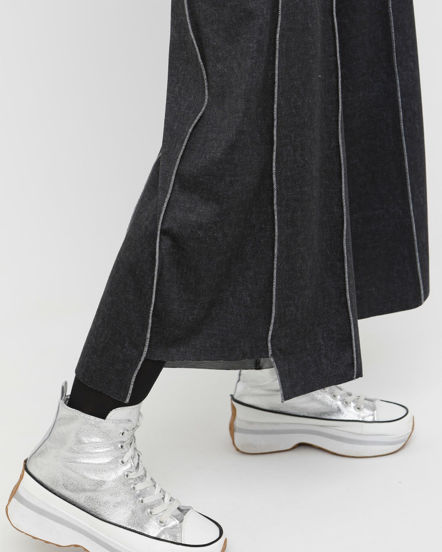 Designed for comfort and structure, this wide-leg trouser is cut from smooth, stretch-infused denim that flatters with ease. The high-rise waist combines a flat front with an elasticized back for pull-on ease, while exposed seams bring a modern edge. Cropped at the ankle to pair effortlessly with boots or flats.