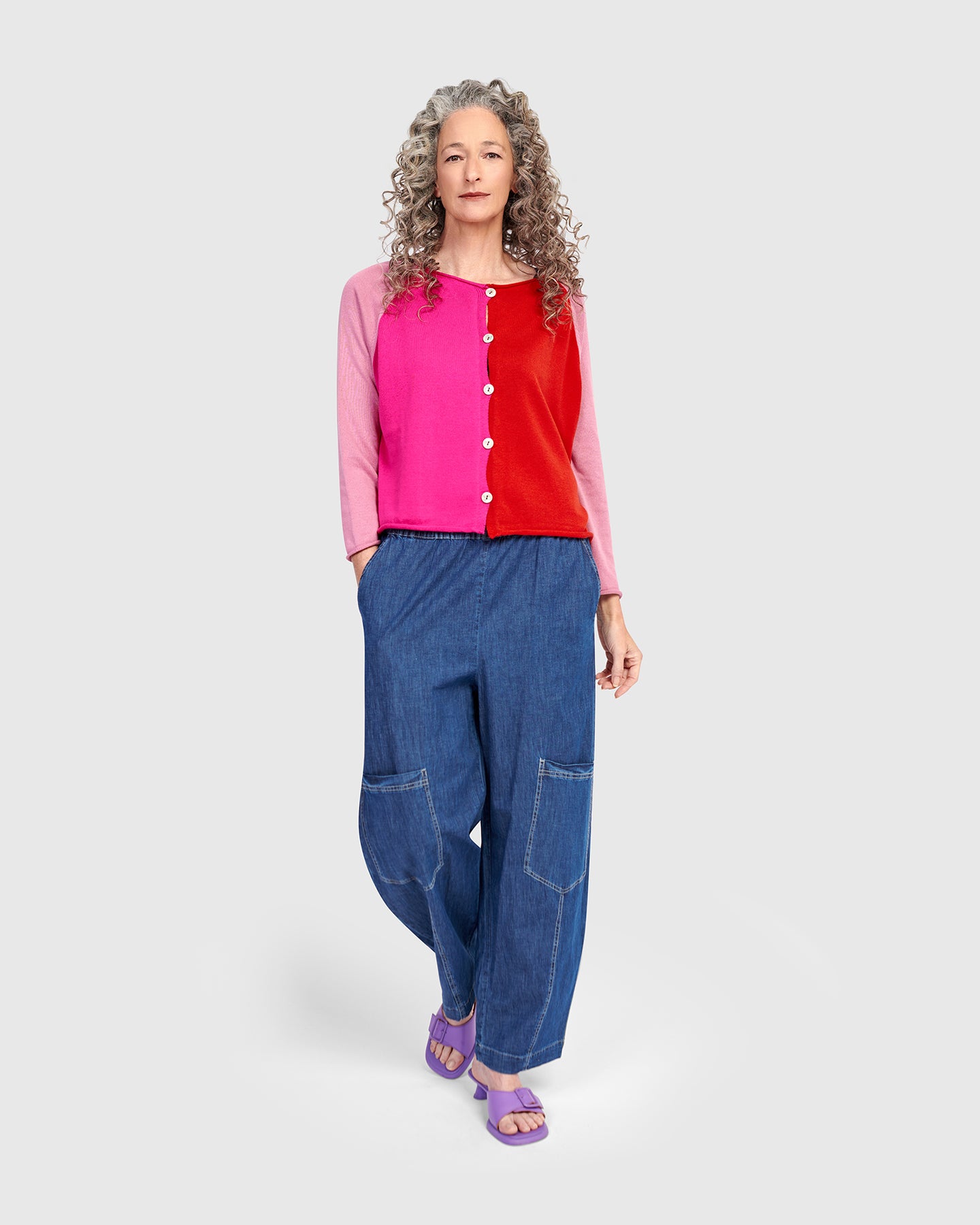 Knit from pure cotton in a lightweight weave, this easy cardigan brings bold character to everyday looks with its berry-toned colorblocking. The softly structured shape drapes with ease thanks to its boxy silhouette, while rolled edges and shell buttons add refined texture.
