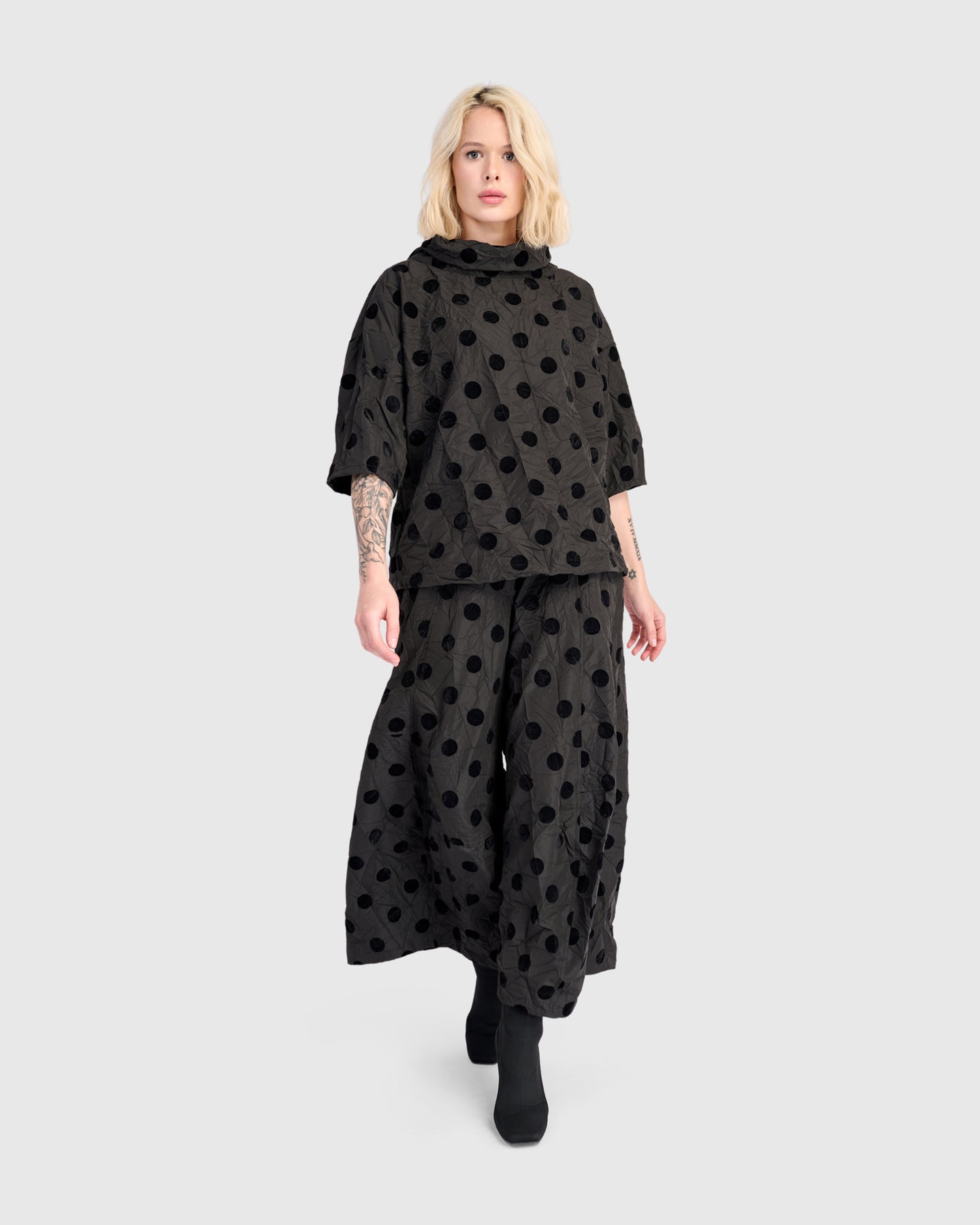 Eveningwear made easy. Crafted in black-on-black dots on a remarkably lightweight crinkled taffeta, this look turns heads while keeping you effortlessly comfortable all night long.