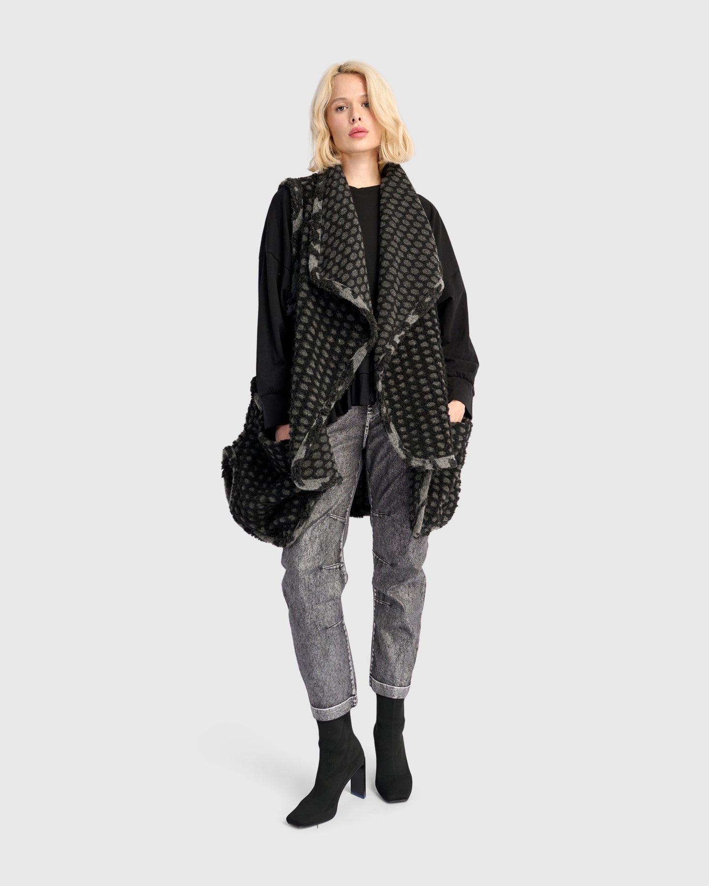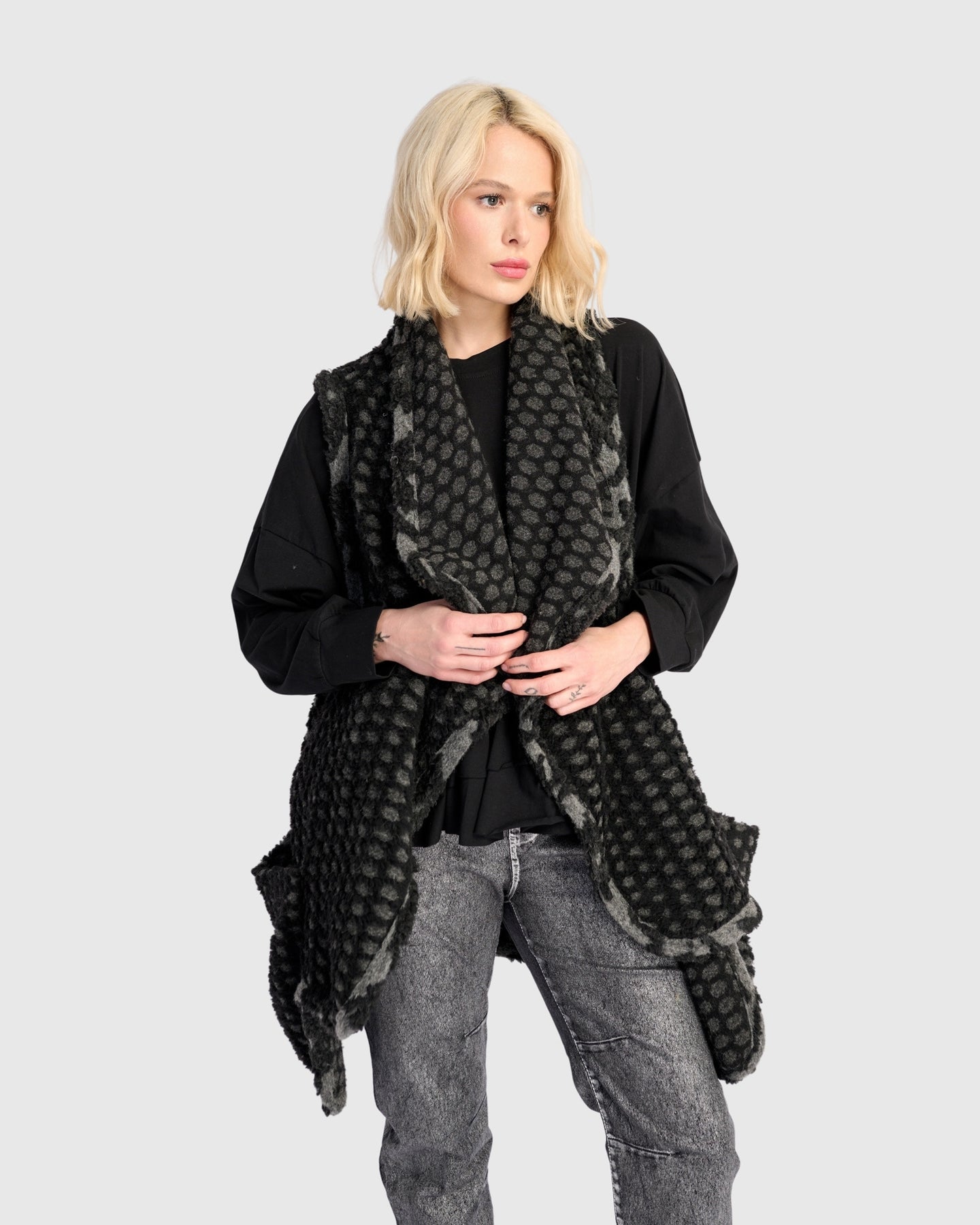 Dramatic draping meets practical layering in this oversized vest, designed with a soft brushed knit and exaggerated lapels that flow open at the front. Its mid-length cut and deep armholes make it ideal over fitted knits or lightweight tees. Finished with patch pockets and contrast trim for a modern edge, it adds cozy structure to everyday looks.