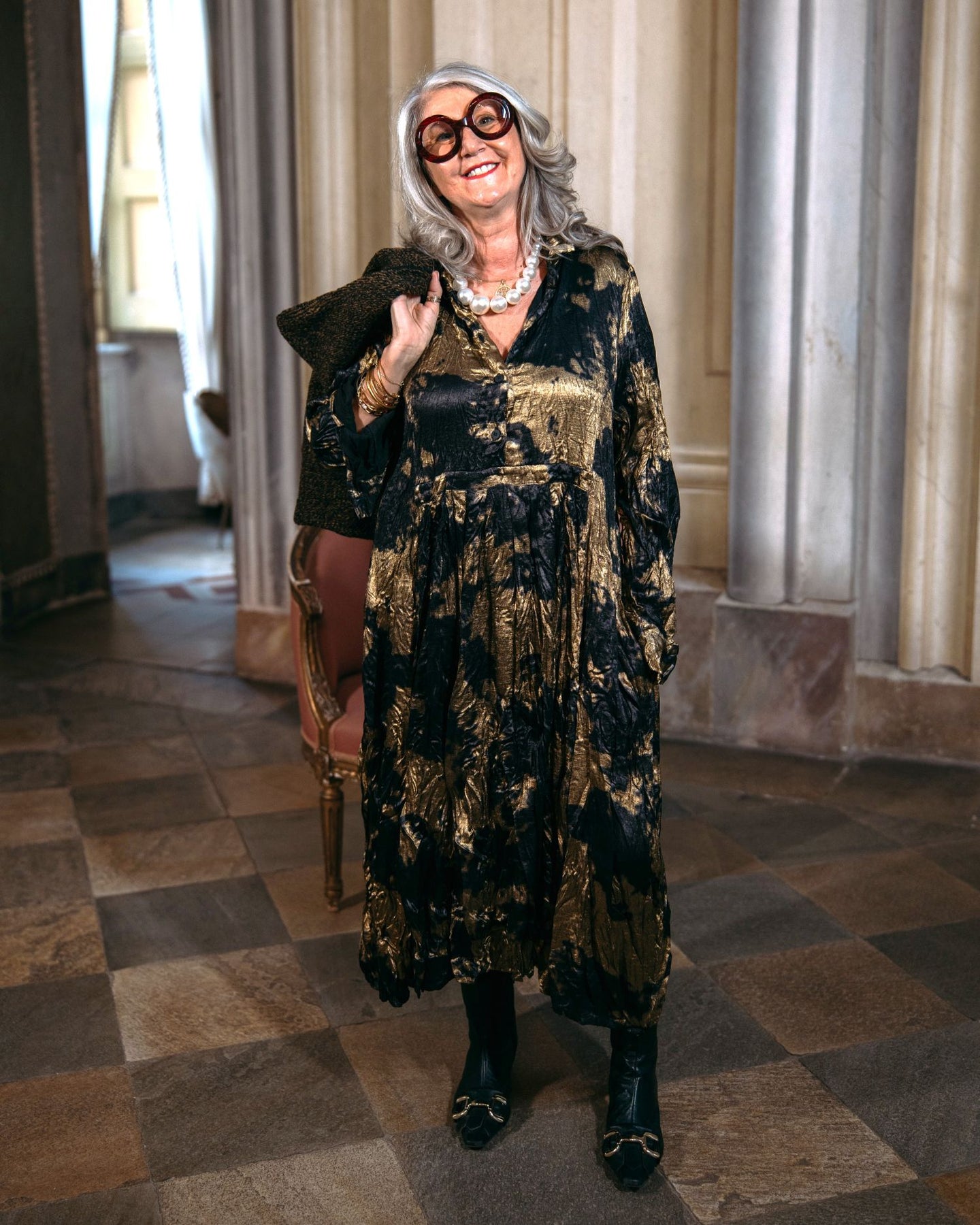 This shimmering gold shirtdress brings playful structure to a relaxed fit. Cut from a crinkled metallic fabric, it flows from a gathered babydoll waist into a generous skirt. Tailored details include button cuffs and a foldover collar, balanced by soft, swingy volume.
