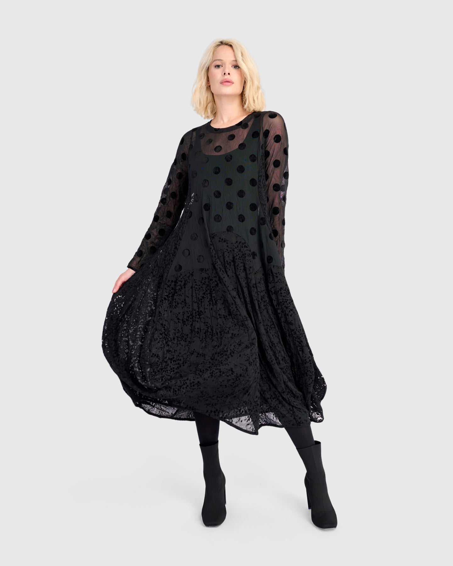 A sheer take on the signature silhouette, this cocoon dress combines body-skimming softness with sculptural volume. The silhouette floats from bust to hem in airy mesh detailed with velvet dots and delicate lace. A crew neckline and set-in sleeves bring tailored edge, while the included slip ensures wearable coverage. Designed to shape without clinging, it's an effortless choice for evening or occasion dressing.