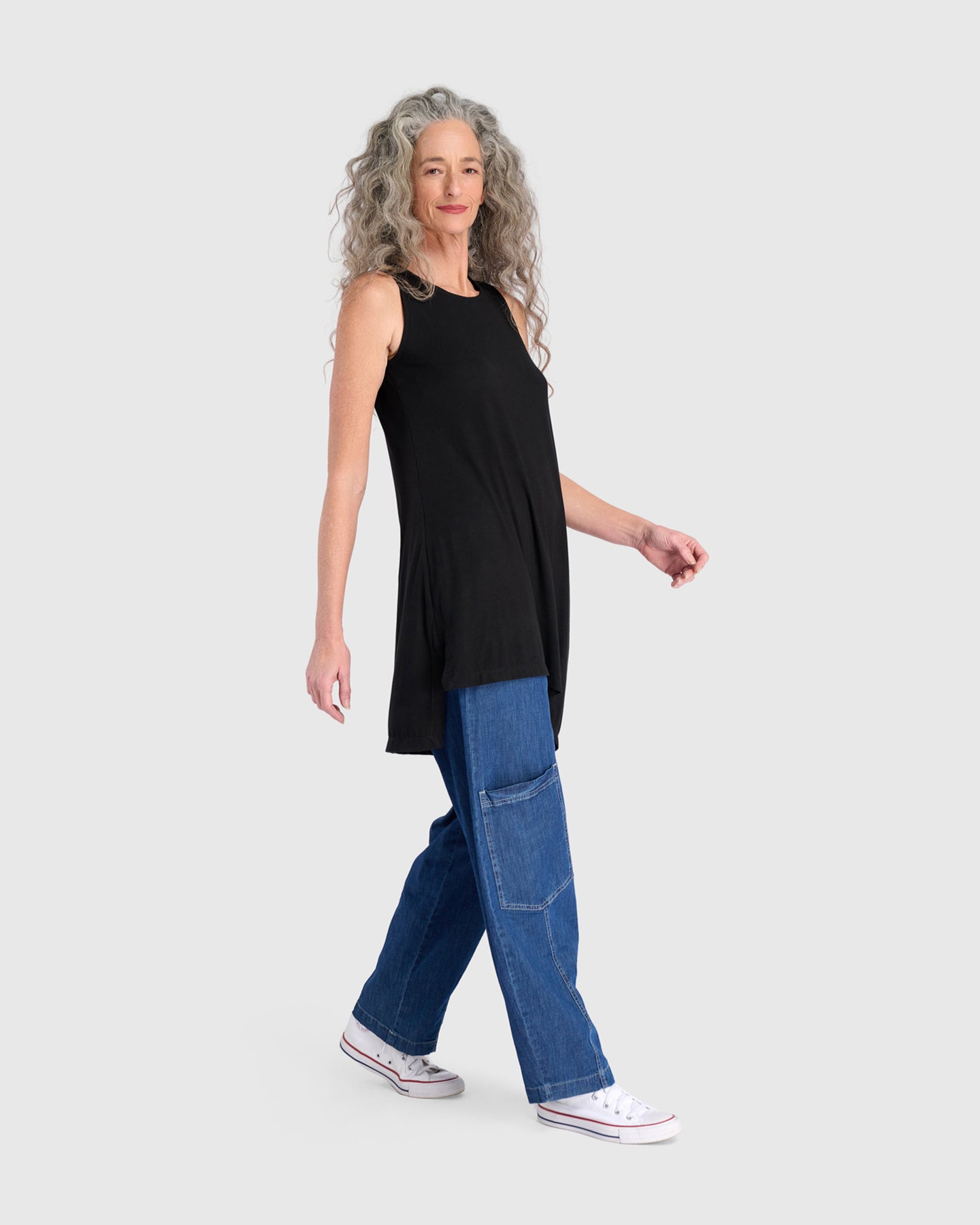 Sleek, sleeveless and rendered in a delicious jersey knit, it's the tunic top you will reach for again and again because it goes with everything in your closet and layers like a pro. Cut for beautiful shape and drape in a pullover design with round neck, one side slit and a chic asymmetrical hem for gorgeous proportions.