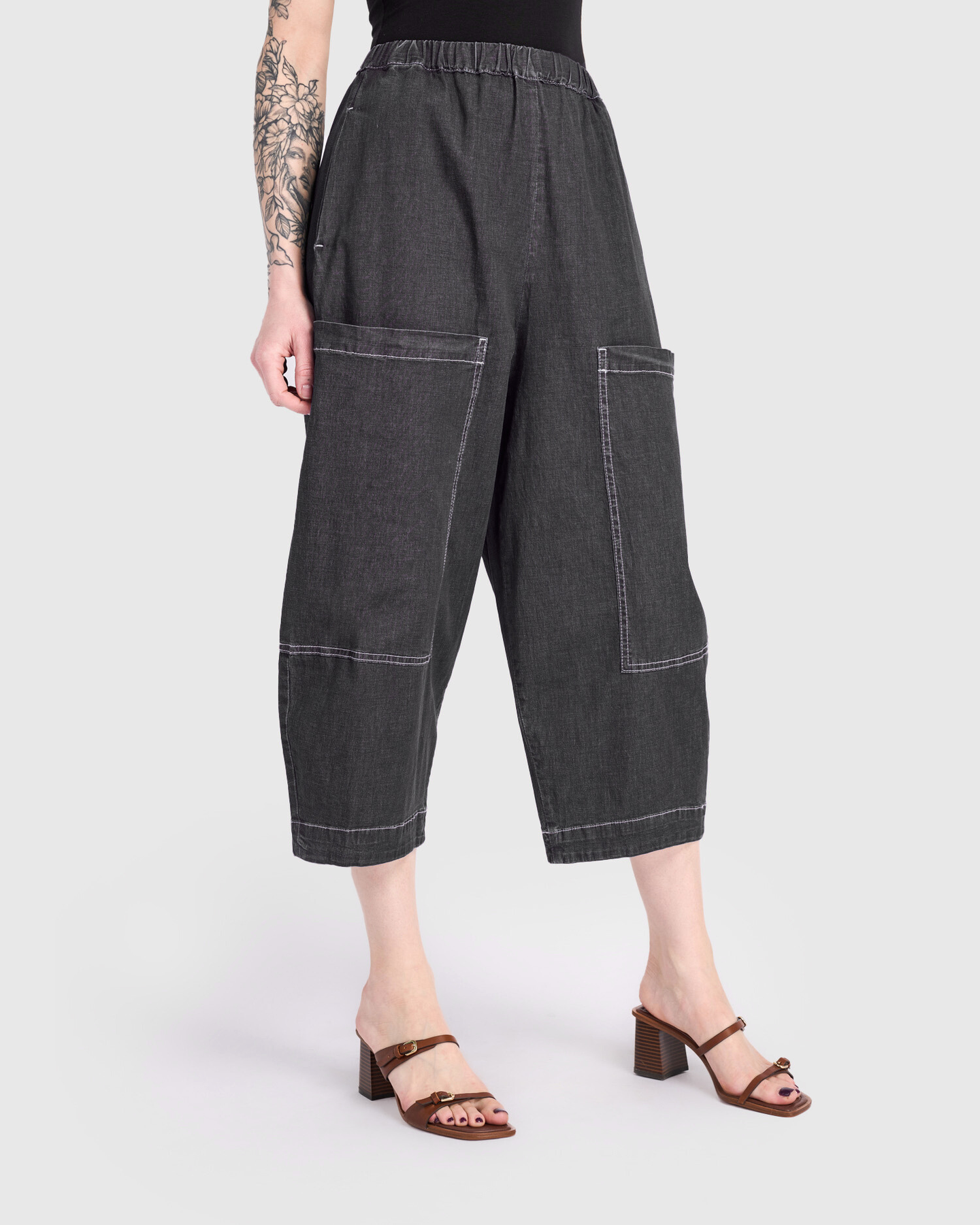 With a bold silhouette and jet-black finish, these cropped barrel pants reframe denim as artful everyday wear. A roomy leg creates cool volume, balanced by a comfortable elastic waist. Oversized front pockets complete the look with practical edge. Wear them with boxy tops or tailored shirts for contrast and ease.