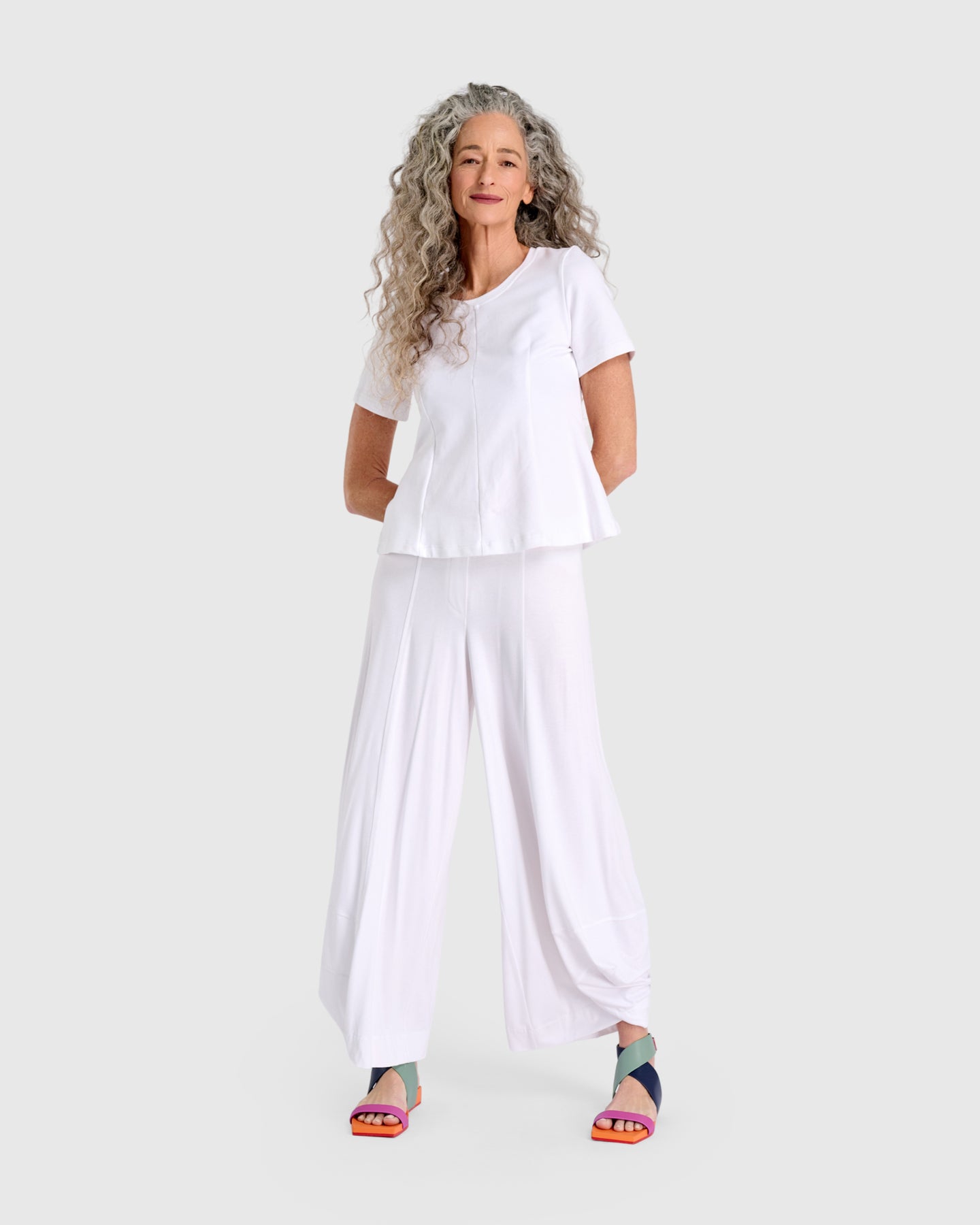 Our signature punto pant is cut in soft baby french terry for everyday comfort with polish. The high-rise silhouette skims the hips and relaxes into a loose leg with the iconic pouf hem. An all-around elastic waistband ensures ease, making this a versatile foundational pant designed for effortless styling.