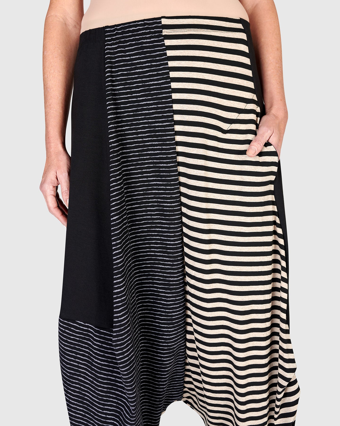 Streetwear meets whimsy in these mixed stripe harem parents. Details: extra-long drop crotch, all-around elastic waist, side pockets, tapered leg. Style them high or low waisted to build a ton of fun outfit variations.