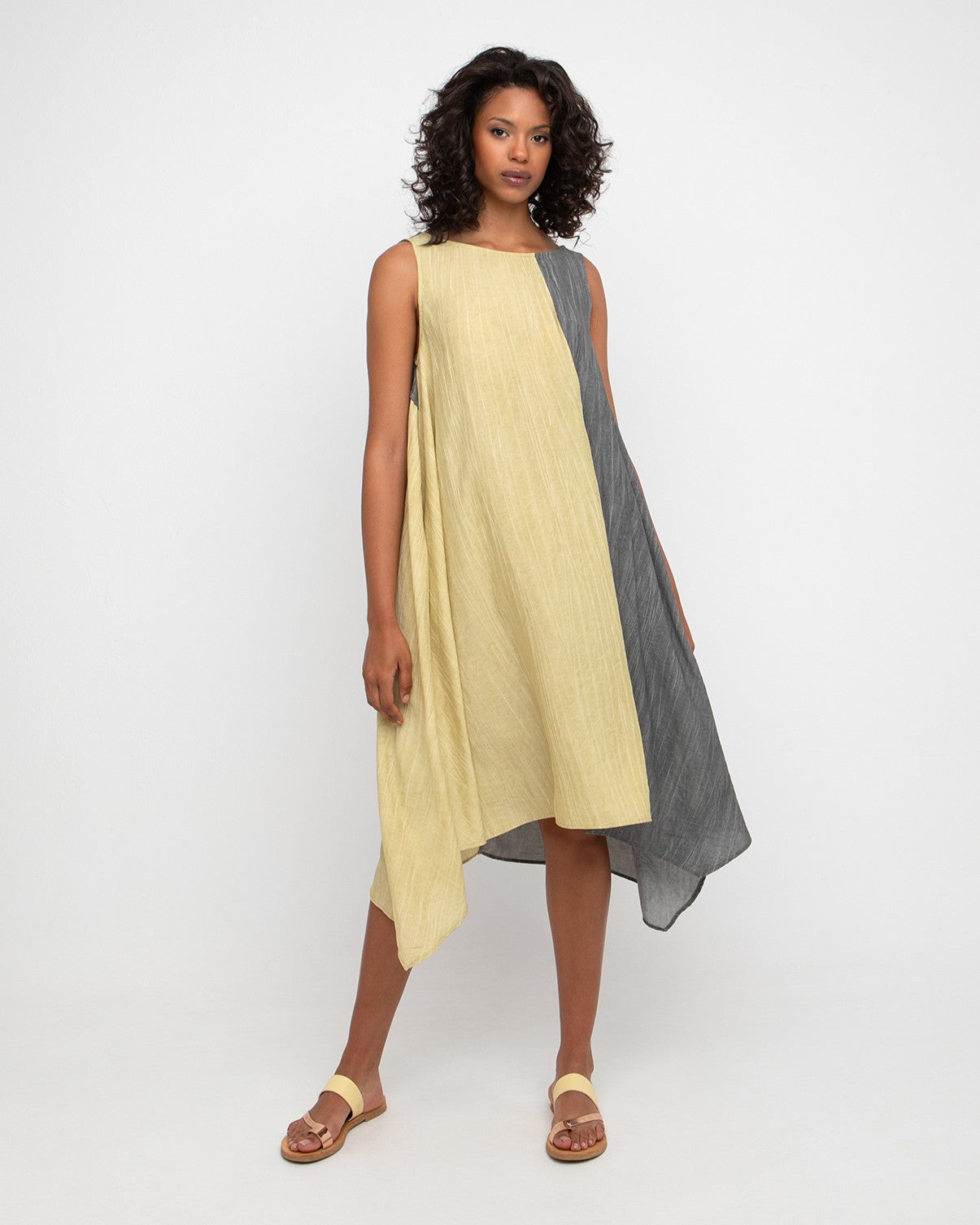 A reversible midi dress with a softly flared shape and generous sweep. The wide neckline and asymmetrical hem create natural movement, while the front-to-back reversible design offers two distinct looks in one. Light colors and textures for a lived-in feel and all-day breathability.