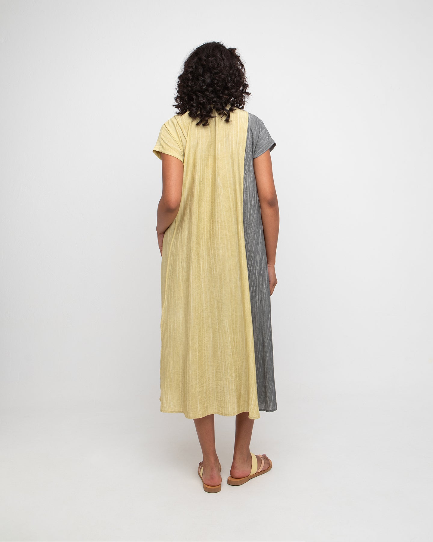 This maxi dress offers easy elegance with an A-line shape and softly crinkled texture. Designed with cap sleeves and a clean collarless placket, it flows from the bust in a relaxed drape. Side pockets and seamed panels add subtle detail to this light, breathable silhouette.
